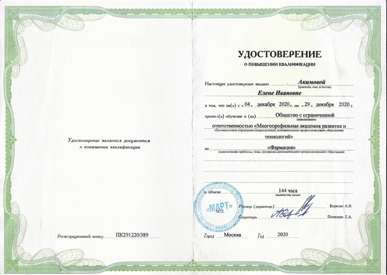 Акимова Елена Ивановна – высококвалифицированный специалист в области фармации с многолетним практическим опытом.