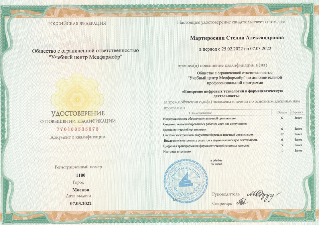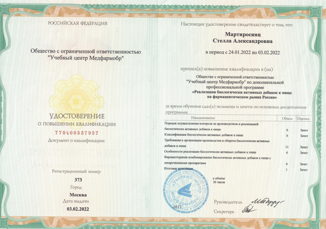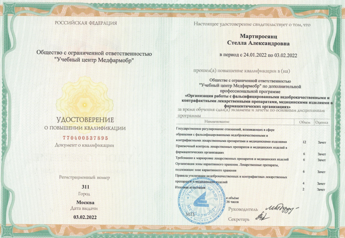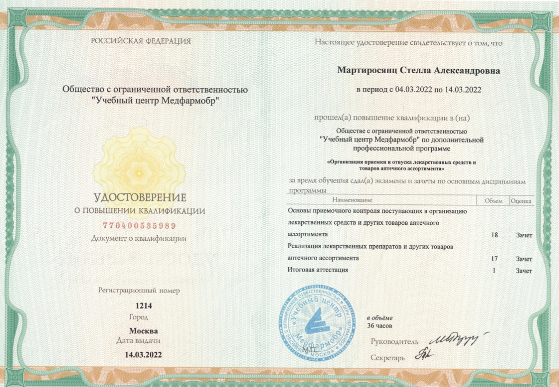 Для постоянного совершенствования профессиональных компетенций Стелла Александровна регулярно проходит дополнительное обучение. В 2022 году она повысила квалификацию в Учебном центре «Медфармобр» по программе, посвященной организации работы с фальсифицированными недоброкачественными и контрафактными лекарственными препаратами и медицинскими изделиями. В 2023 году получила специализированный сертификат, подтверждающий освоение программы по эффективным продажам медицинской техники OMRON в кардиологии.