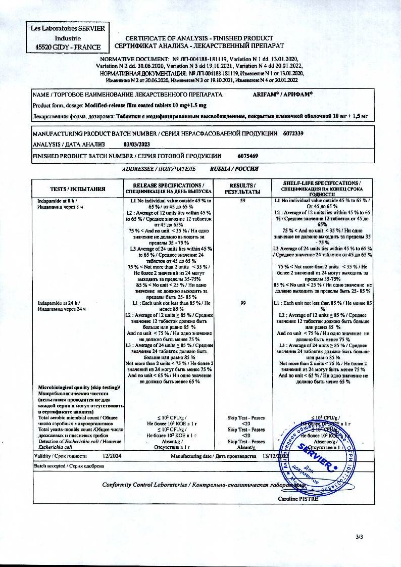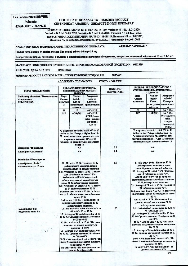 Арифам 10 мг + 1,5 мг 30 шт таблетки покрытые пленочной оболочкой с модифицированным высвобождением