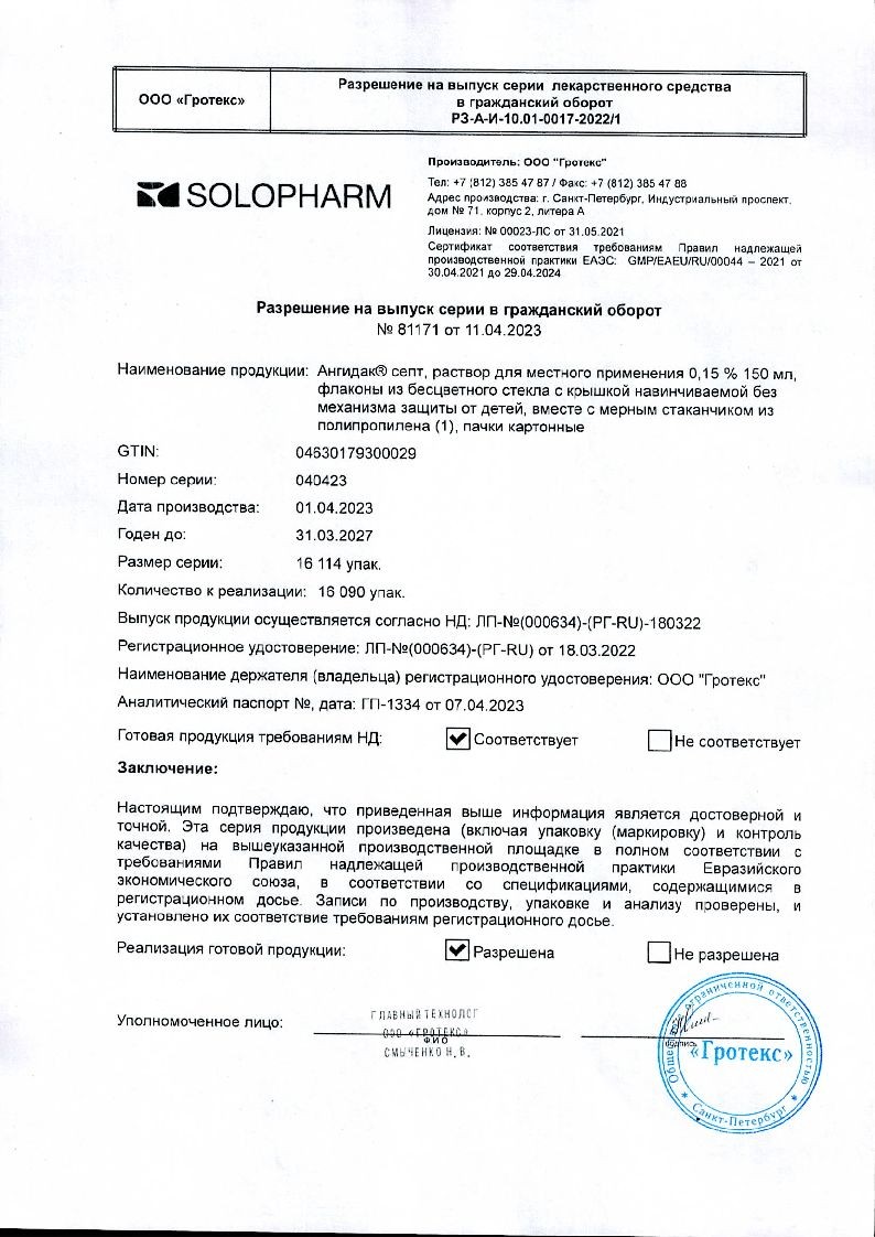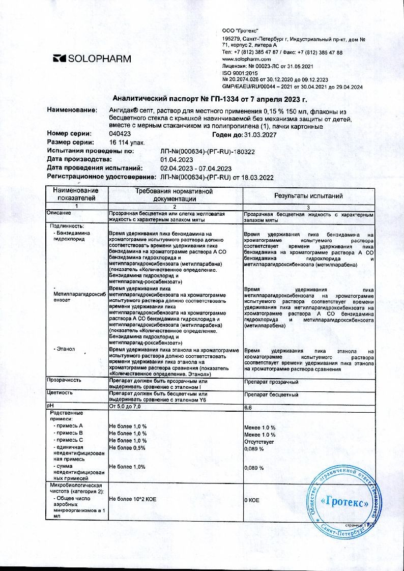 Ангидак септ 0,15% 150 мл раствор для местного применения