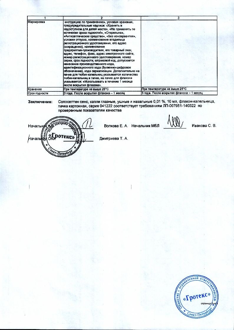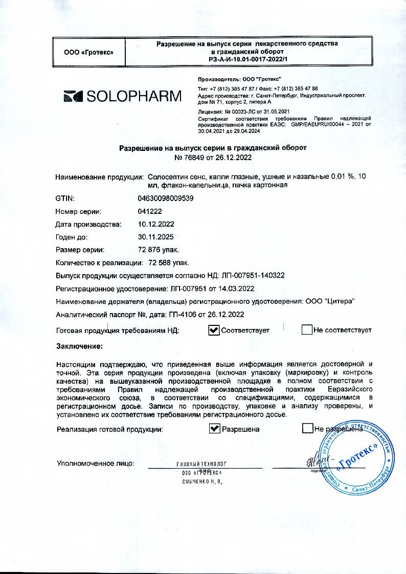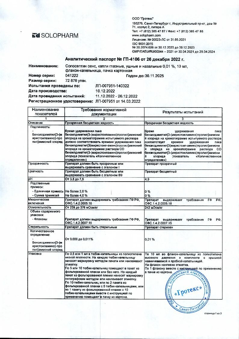 Солосептин Сенс 0,01% 10 мл капли глазные и ушные