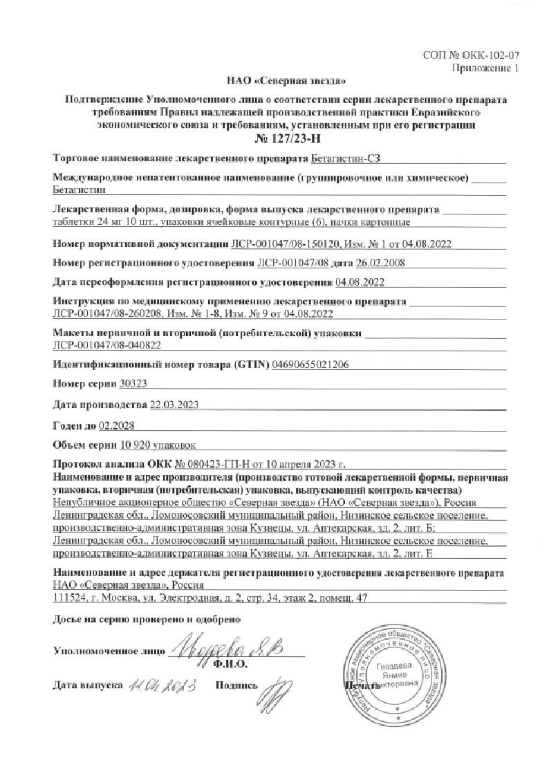 Бетагистин-СЗ 24 мг 60 шт таблетки