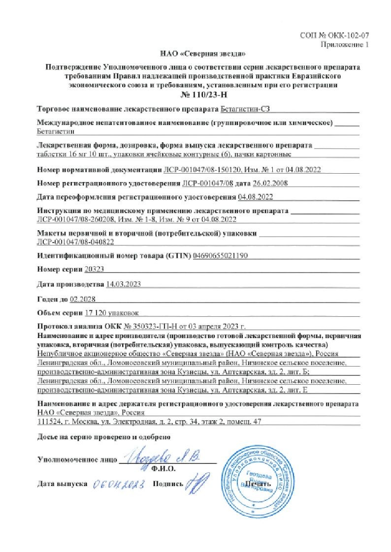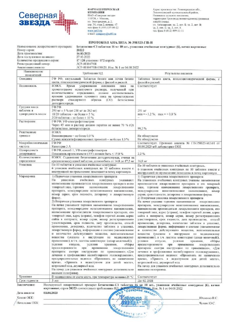 В корзинуБетагистин-СЗ 16 мг 60 шт таблетки