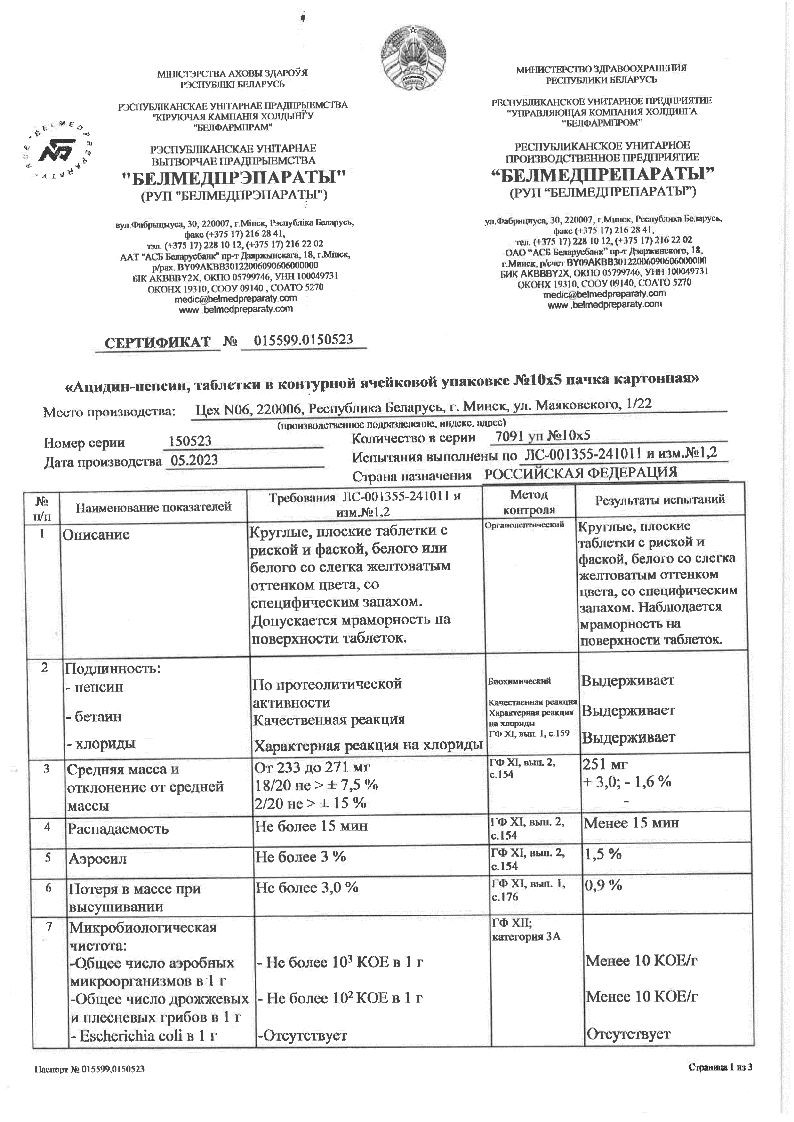 Ацидин-Пепсин 250 мг 50 шт таблетки