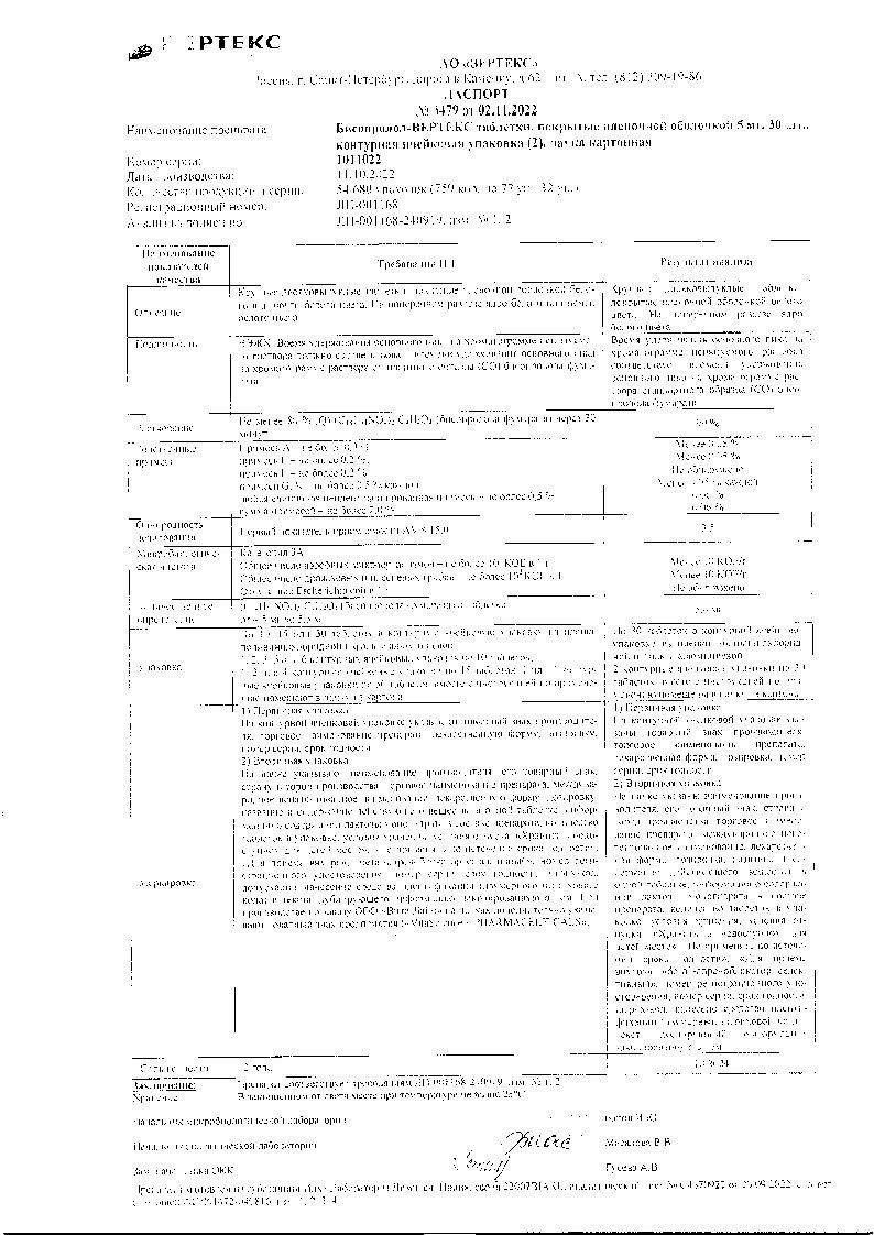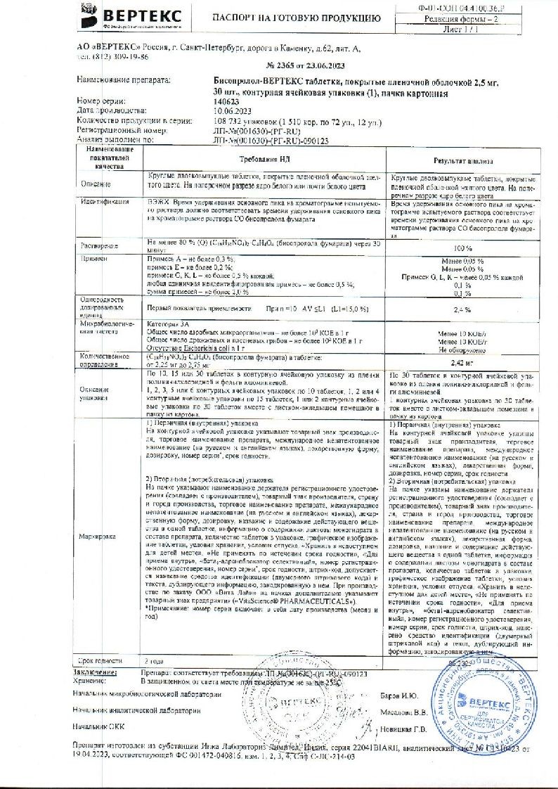 Бисопролол Вертекс 2,5 мг 60 шт таблетки покрытые пленочной оболочкой