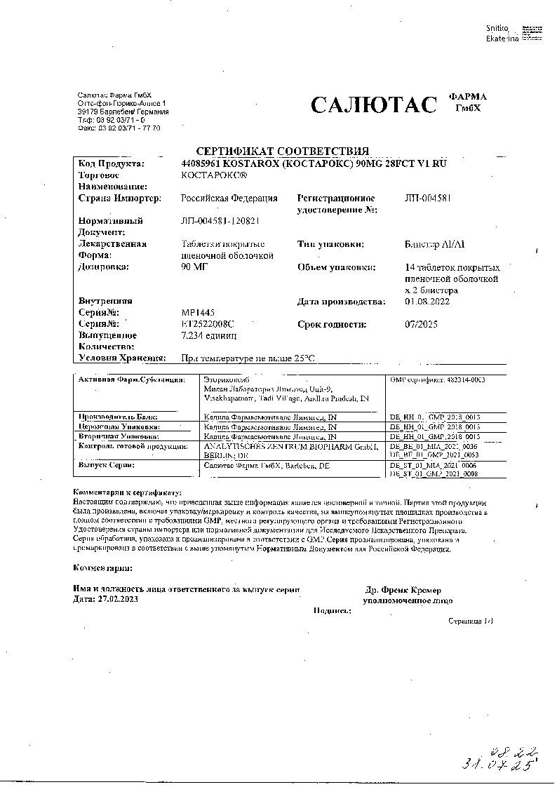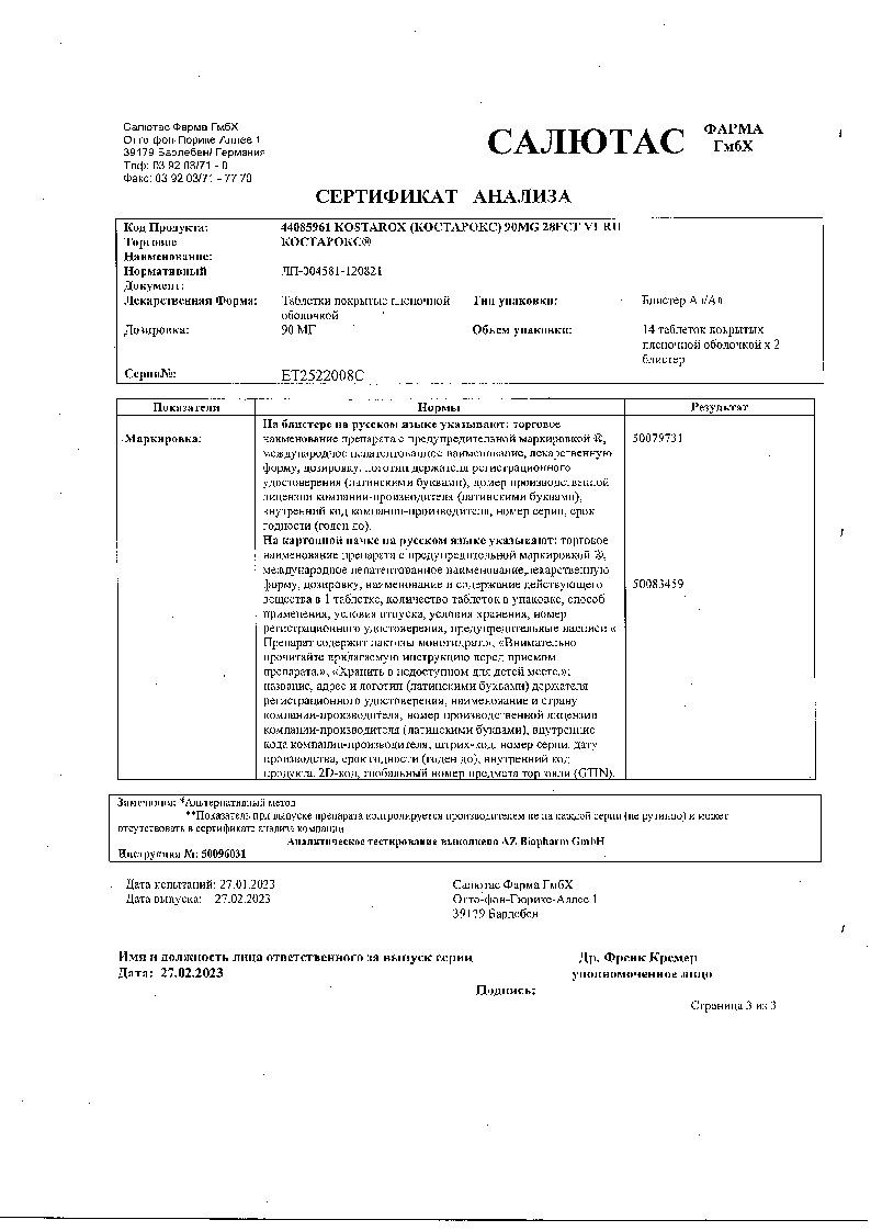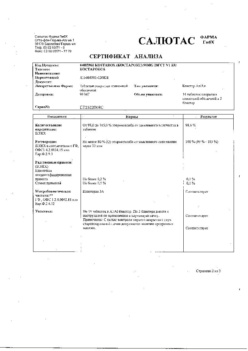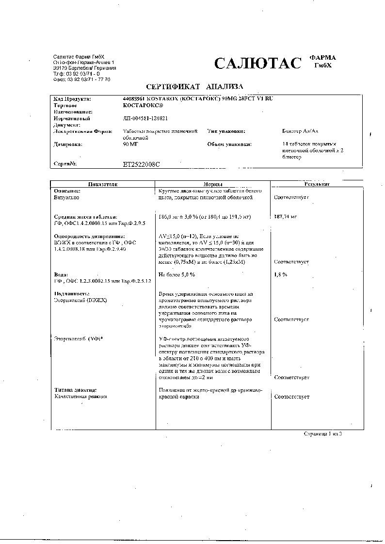 Костарокс 90 мг 28 шт таблетки покрытые пленочной оболочкой
