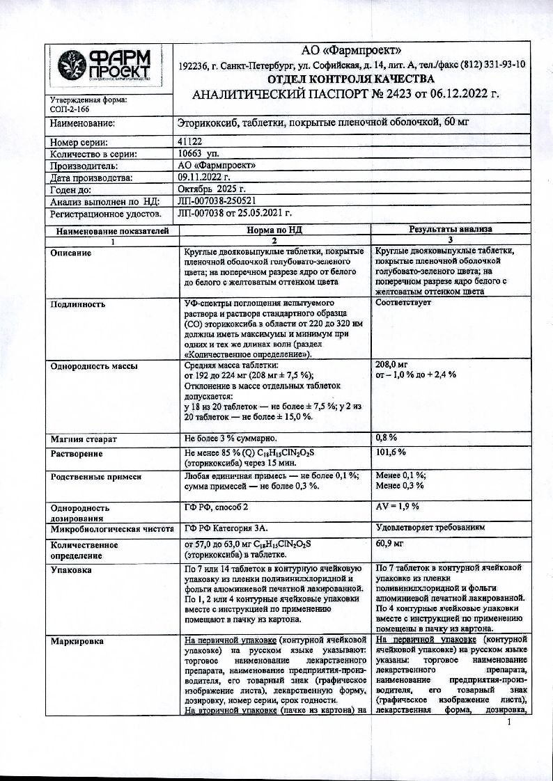 Эторикоксиб 60 мг 14 шт таблетки покрытые пленочной оболочкой