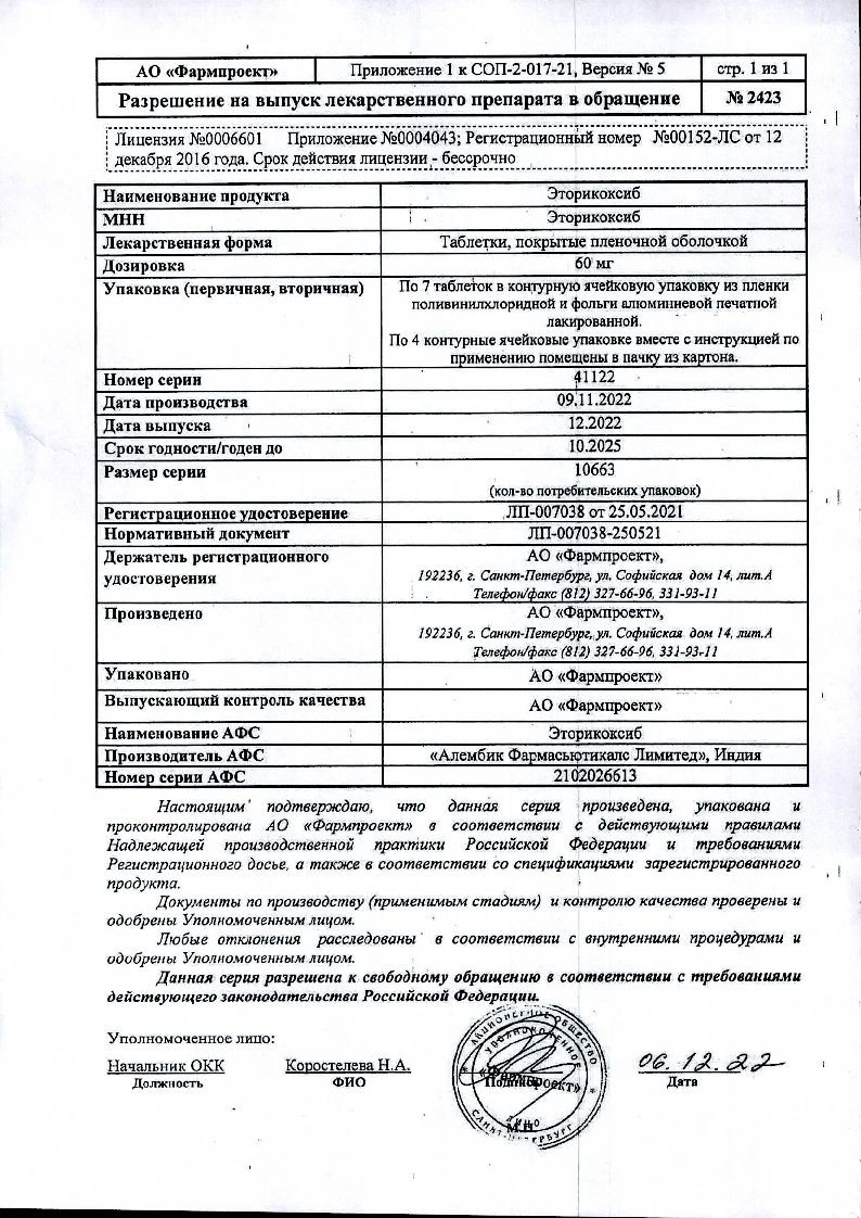 Эторикоксиб 60 мг 28 шт таблетки покрытые пленочной оболочкой