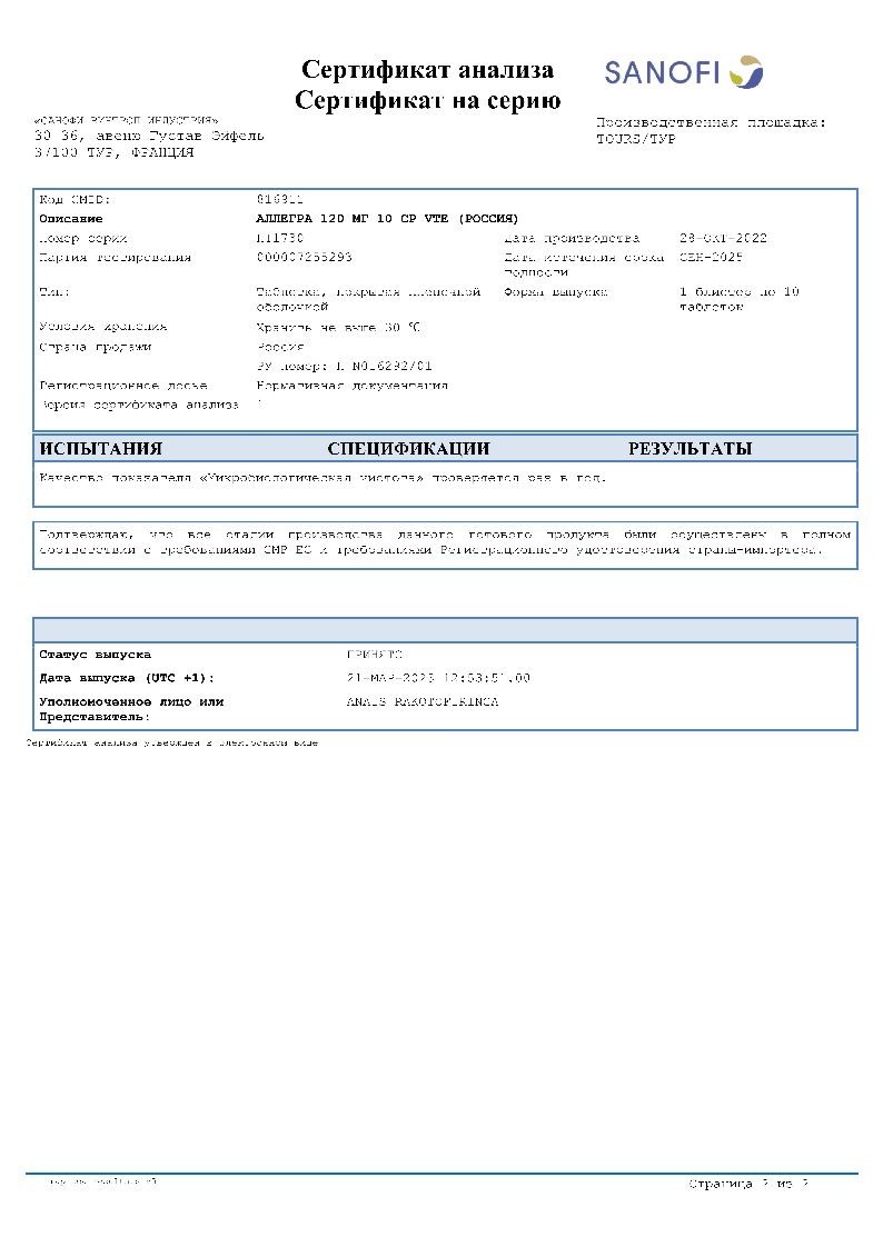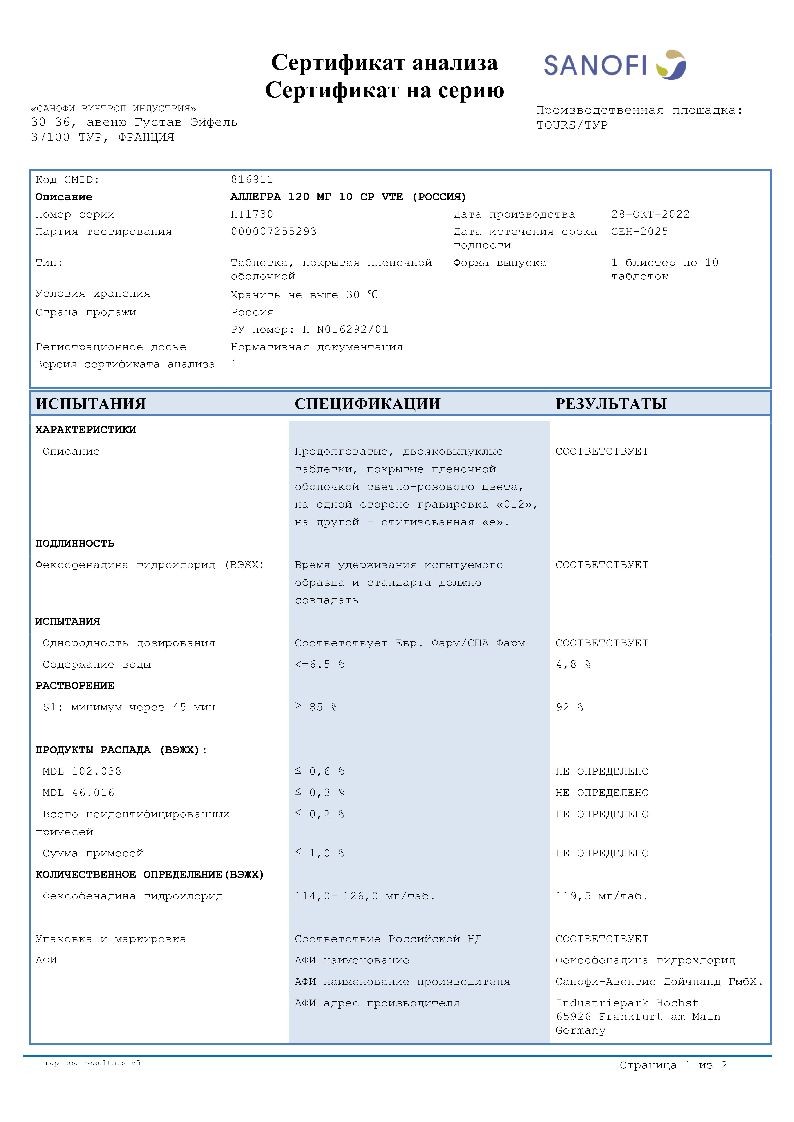 Аллегра 120 мг 10 шт таблетки покрытые пленочной оболочкой
