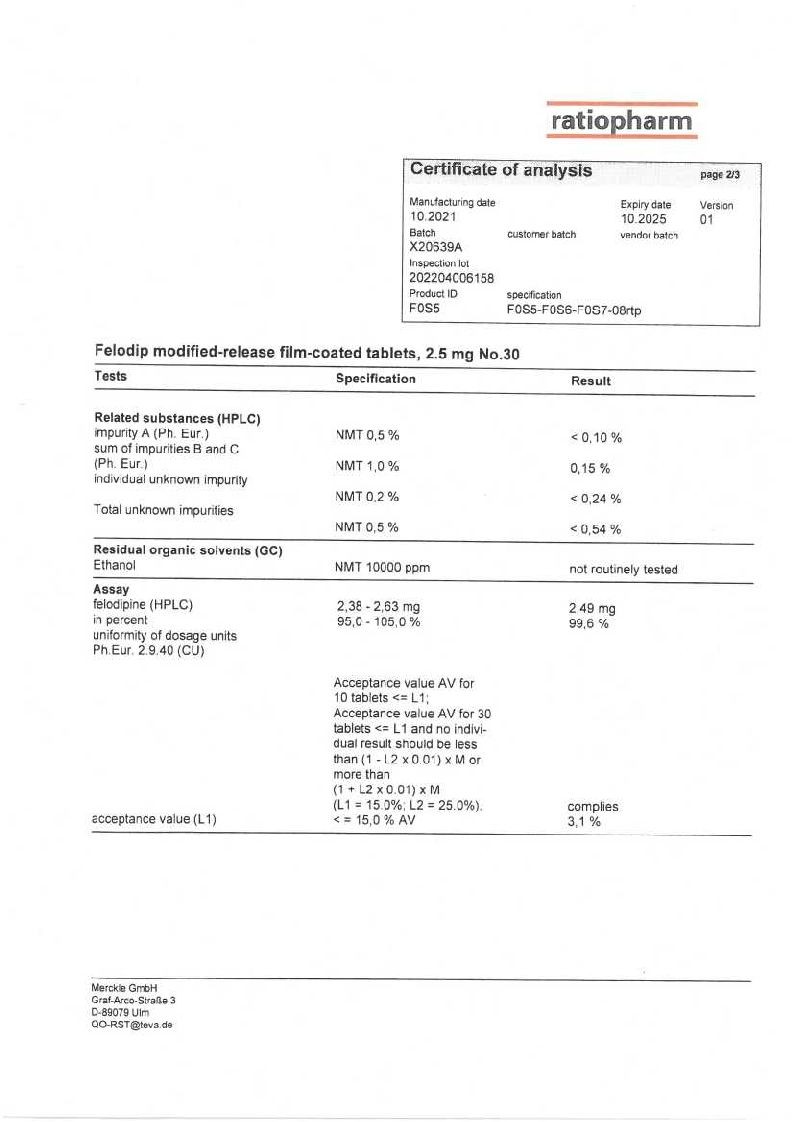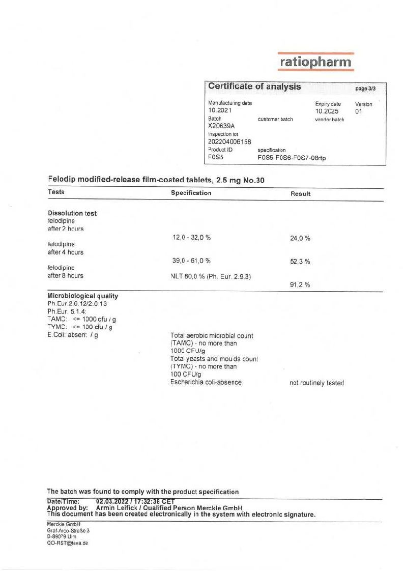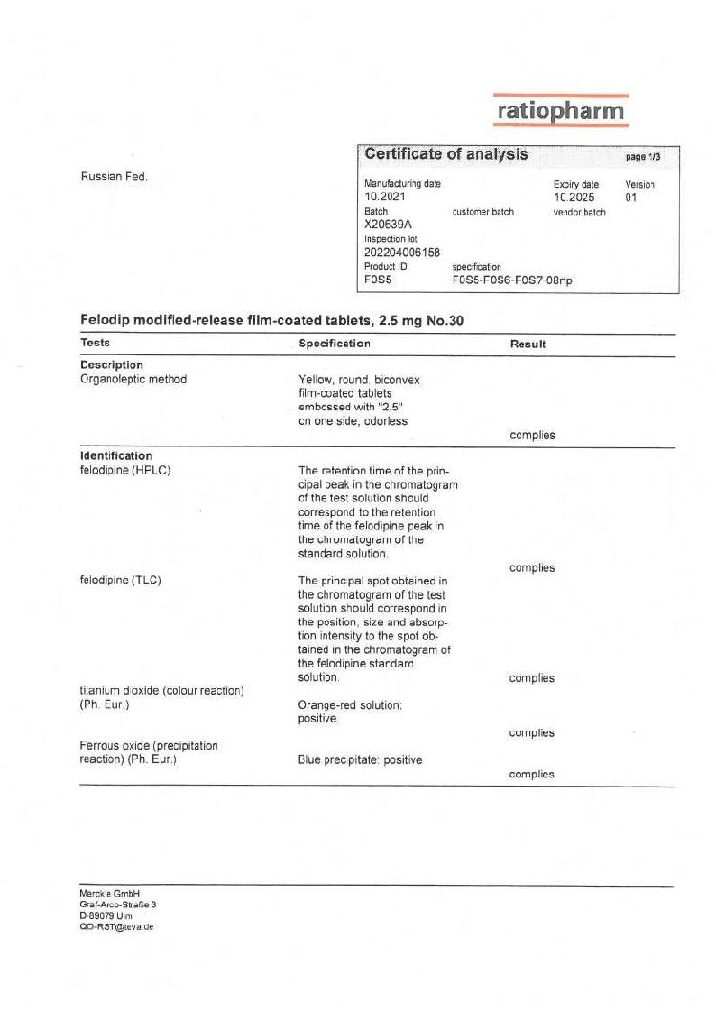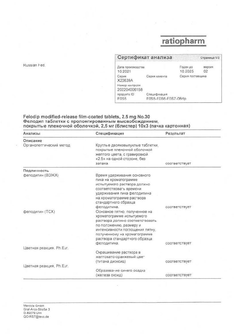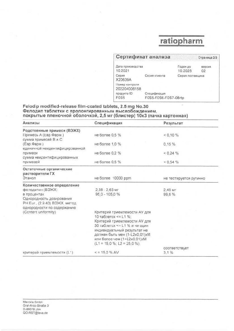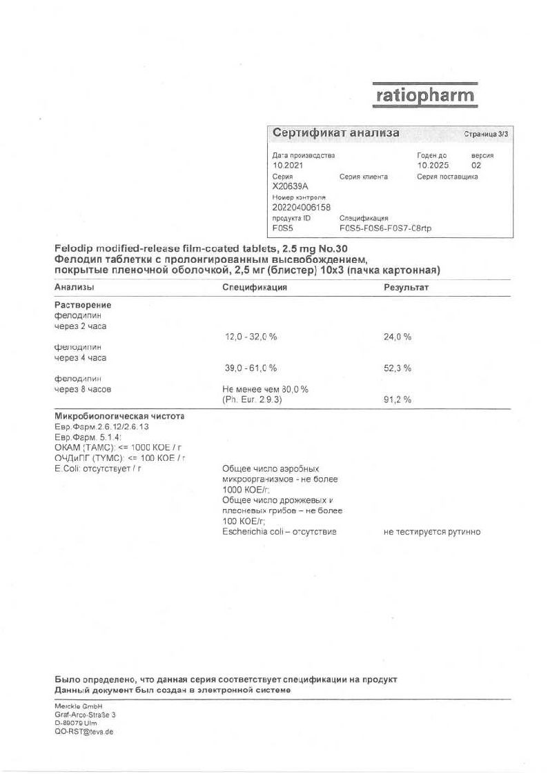 Фелодип 2,5 мг 30 шт таблетки с пролонгированным высвобождением покрытые пленочной оболочкой