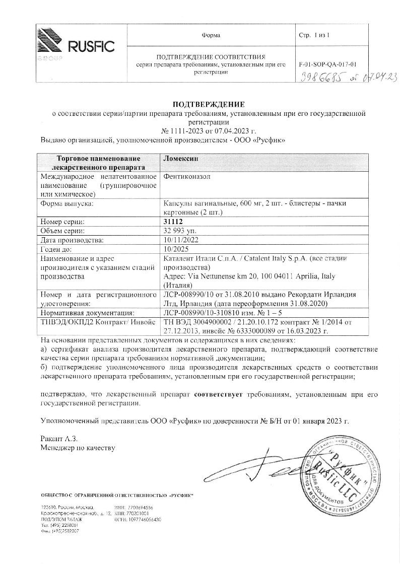 Ломексин 1000 мг 1 шт капсулы вагинальные