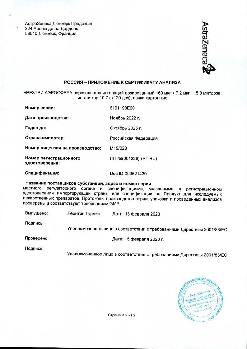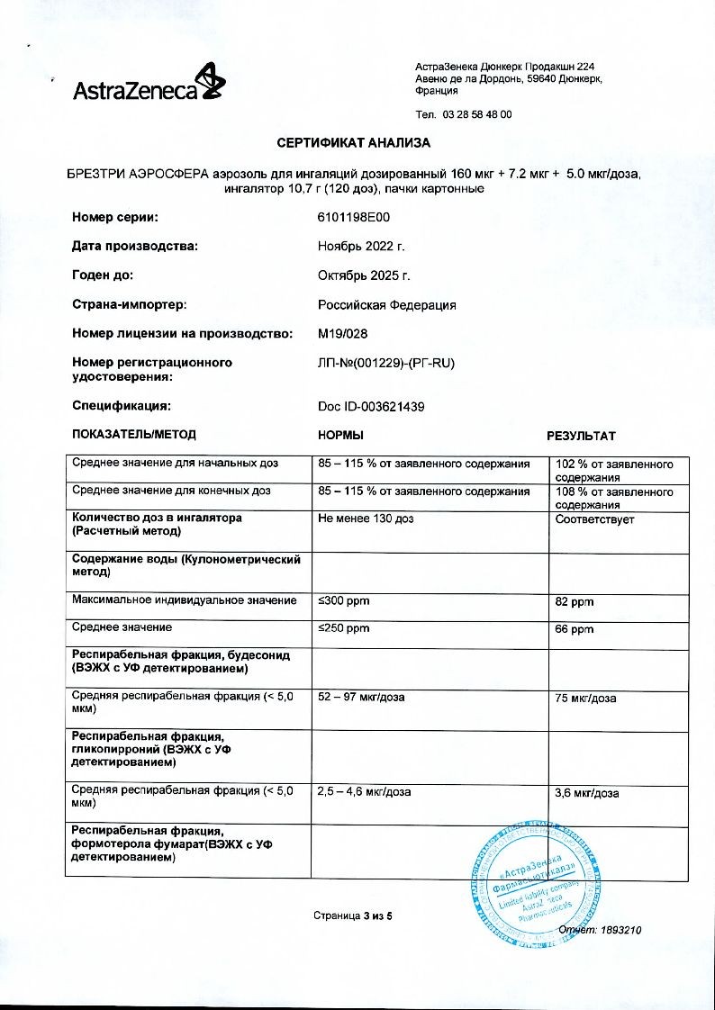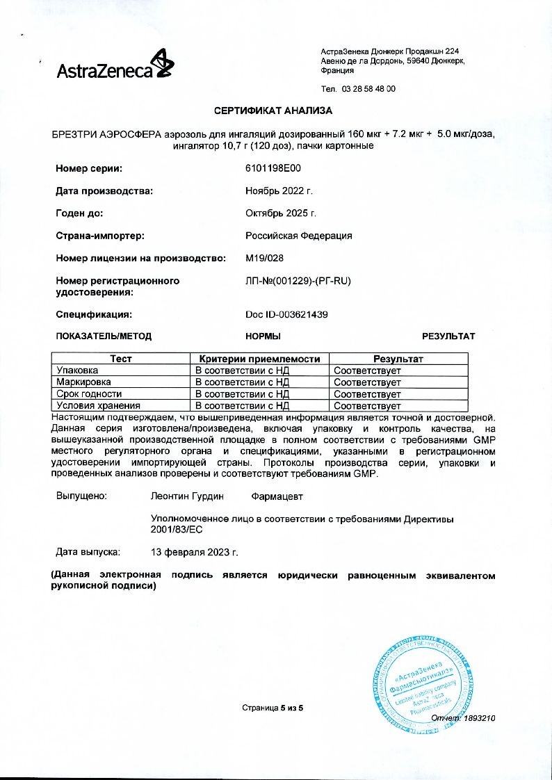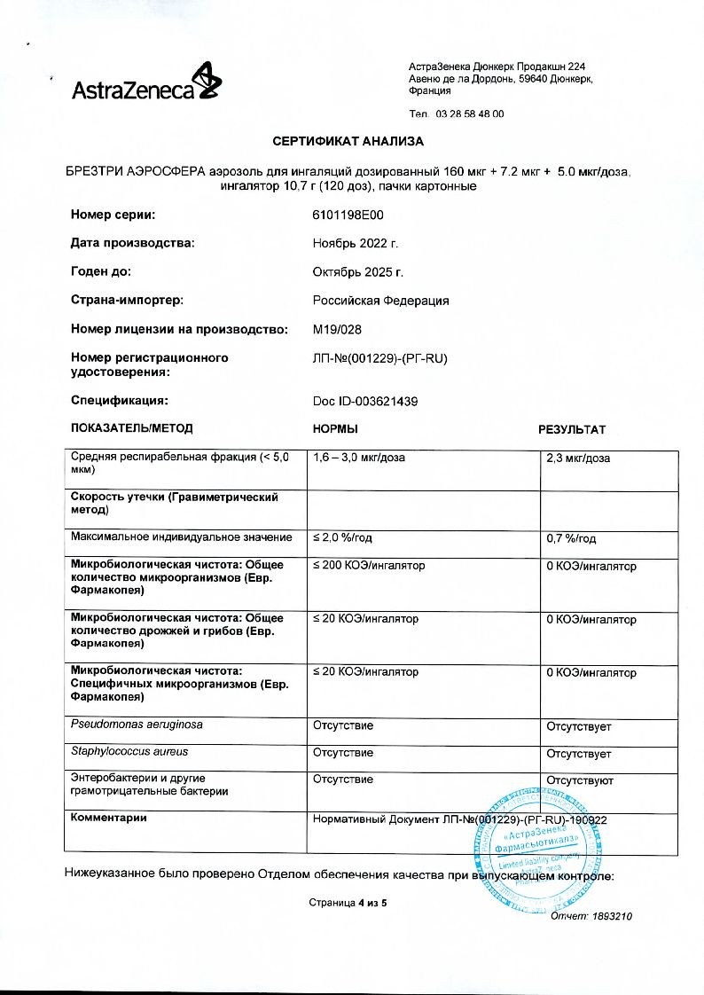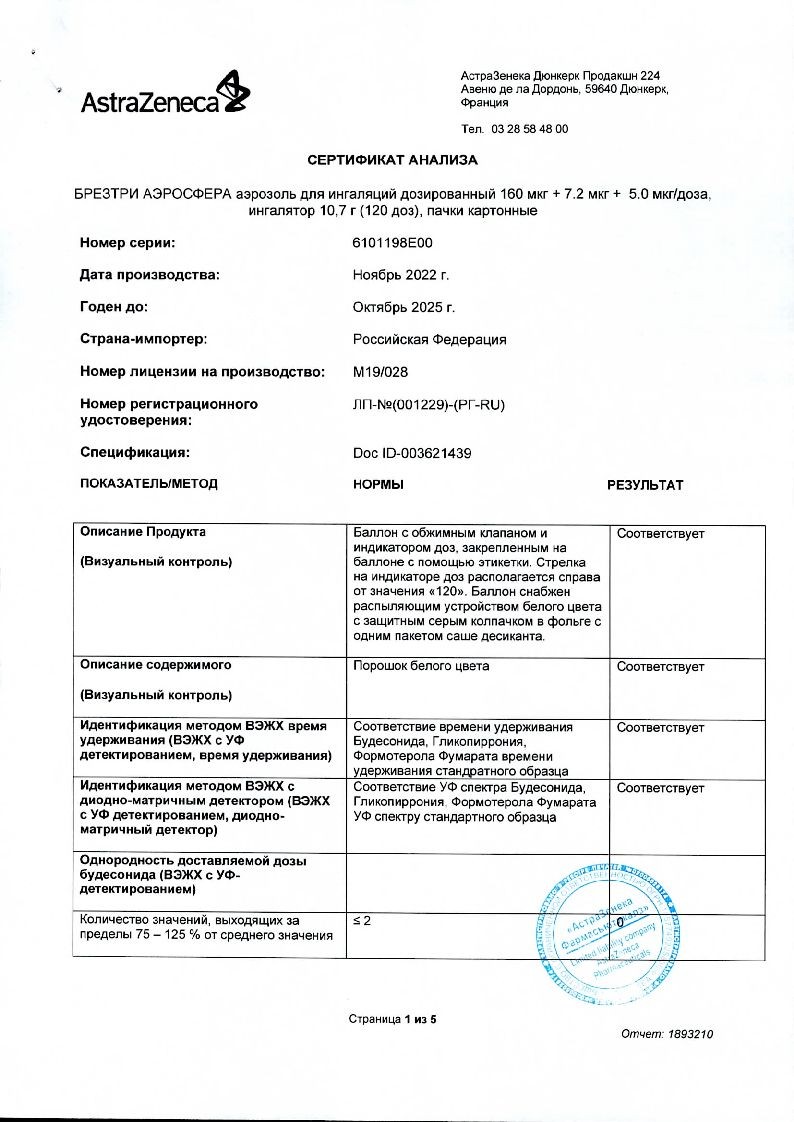 Брезтри Аэросфера 160 мкг + 7,2 мкг + 5,0 мкг/доза 120 доз 10,7 г аэрозоль для ингаляций дозированный ингалятор 1 шт