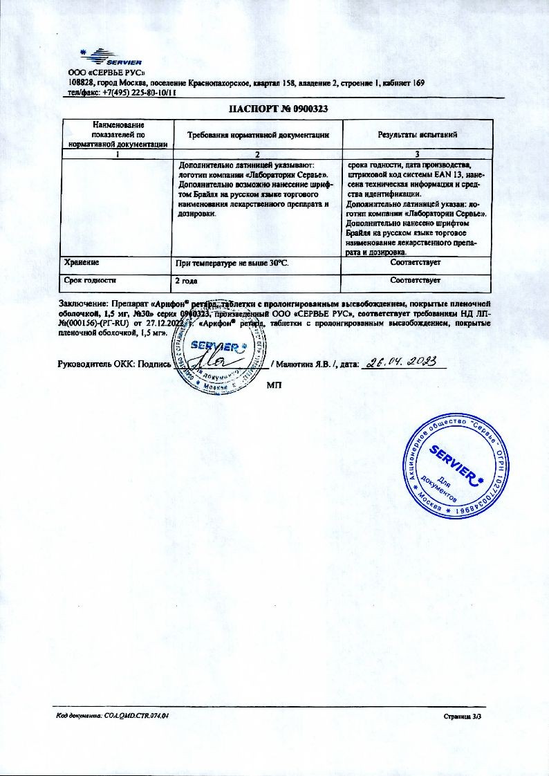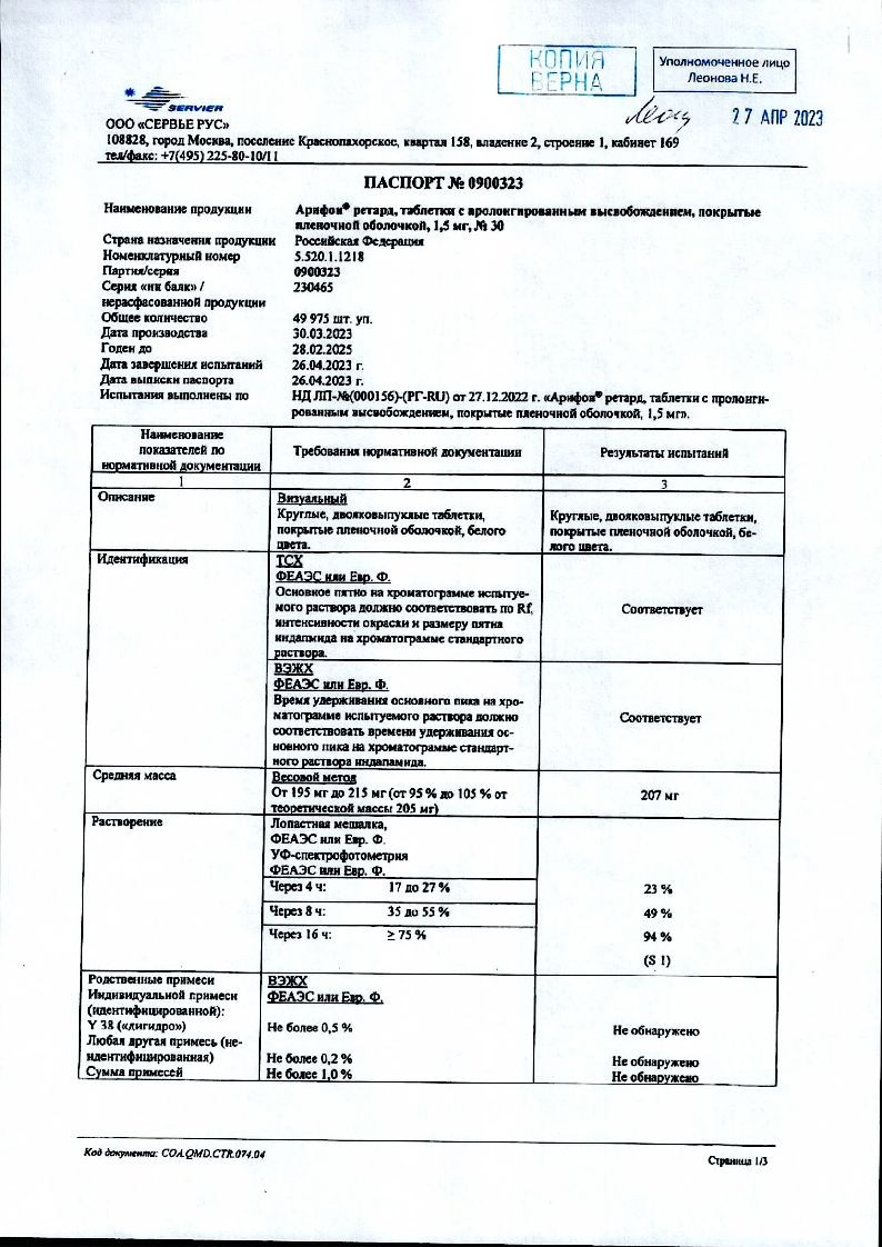 Арифам 10 мг + 1,5 мг 30 шт таблетки покрытые пленочной оболочкой с модифицированным высвобождением
