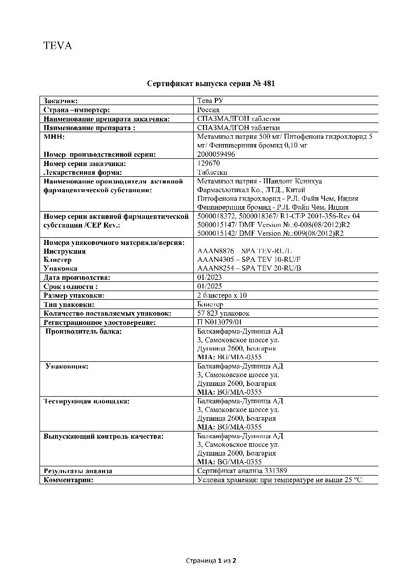 Спазмалгон 2 мл 10 шт раствор для инъекций