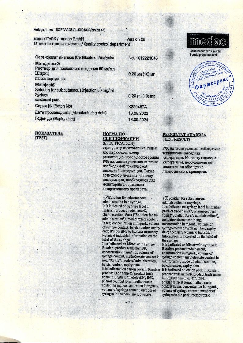 Методжект 7,5 мг 50 мг/мл 0,15 мл 1 шт раствор для инъекций шприц