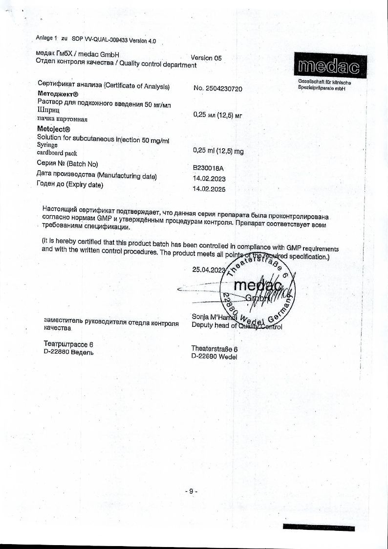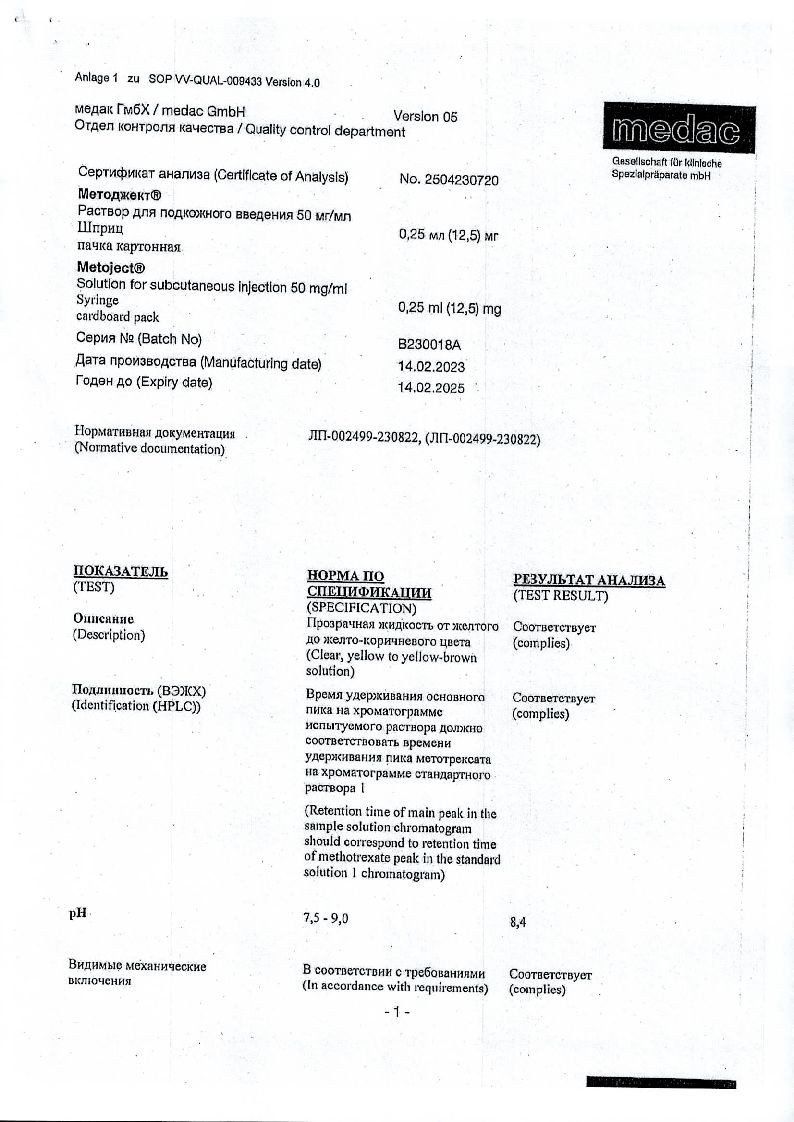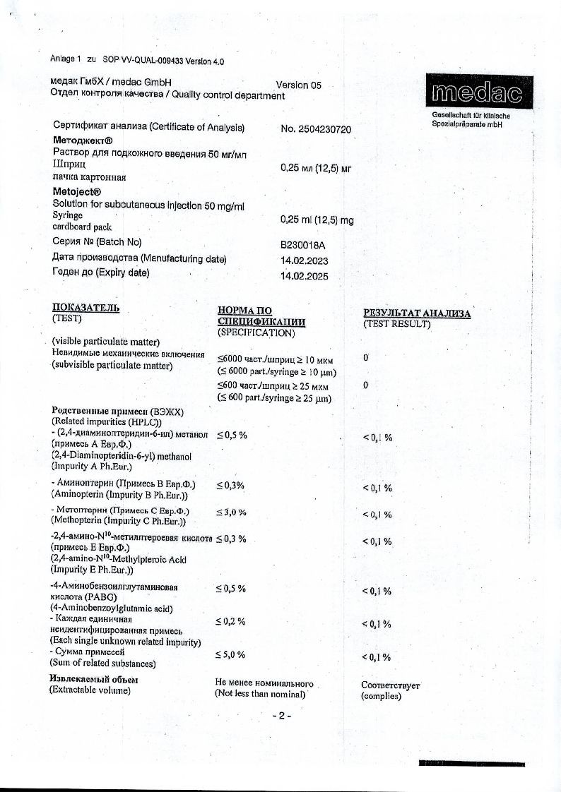 Методжект 50 мг/мл 0,25 мл 1 шт раствор для инъекций шприц в комплекте с иглой
