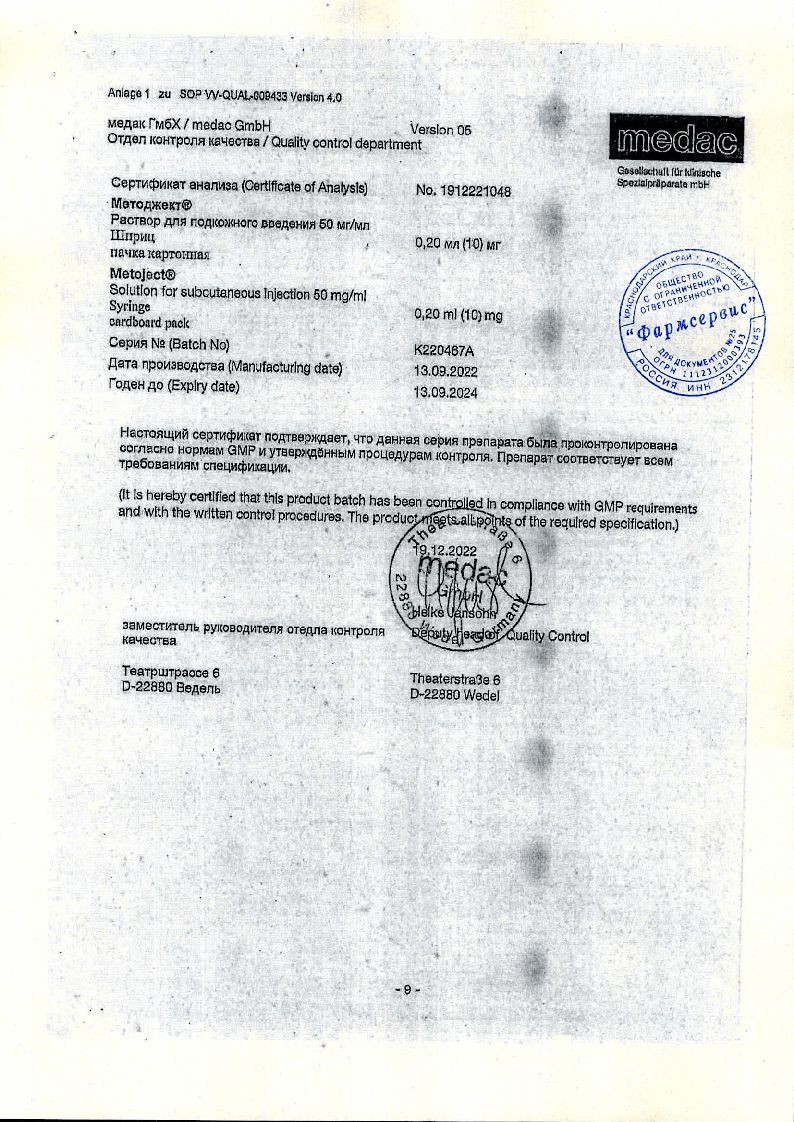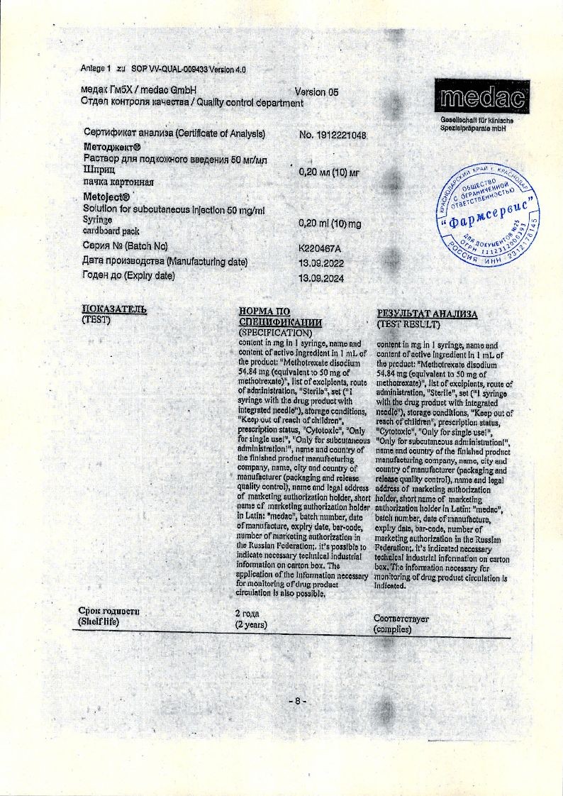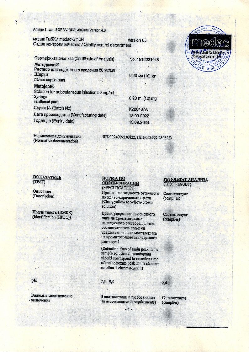 Методжект 50 мг/мл 0,2 мл 1 шт раствор для инъекций шприц в комплекте с иглой