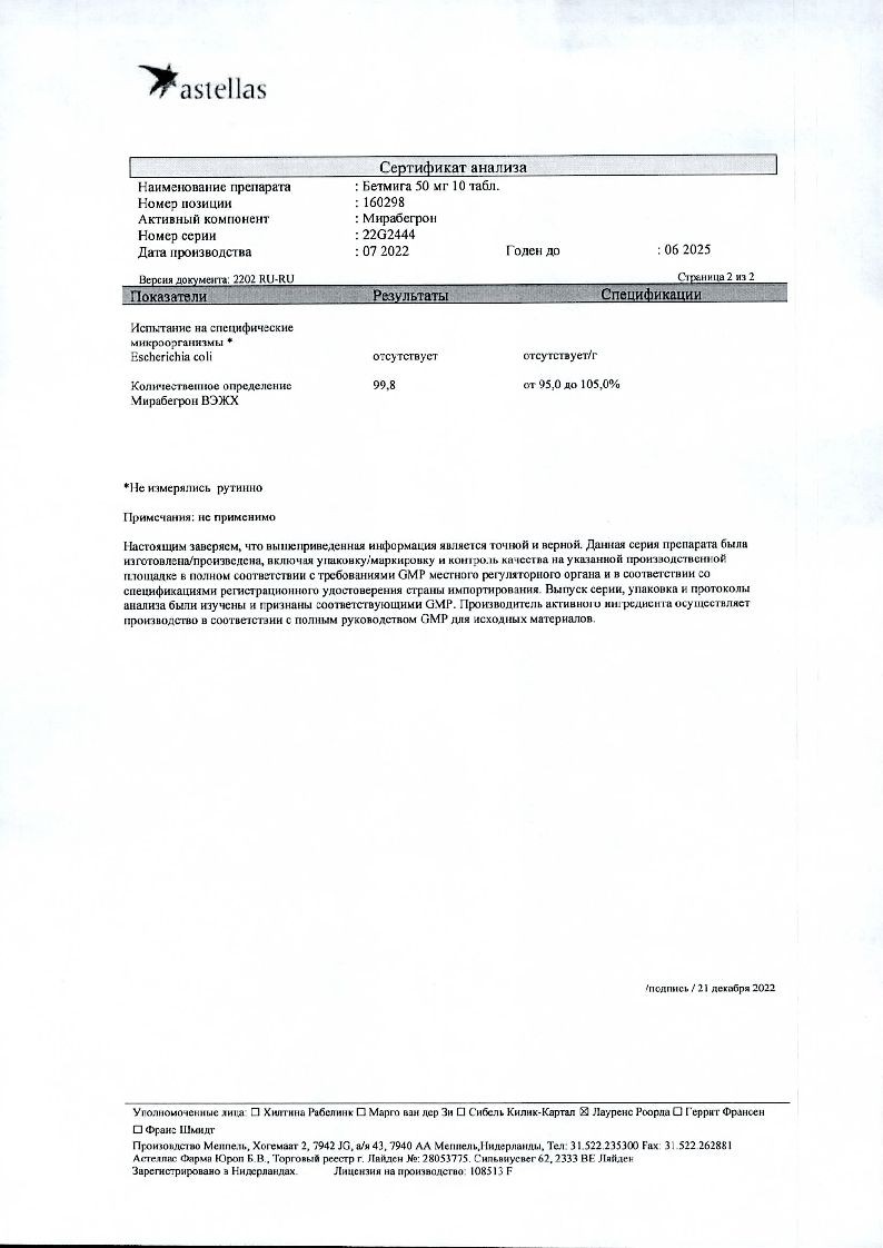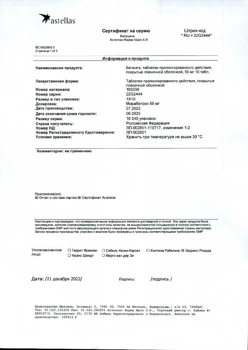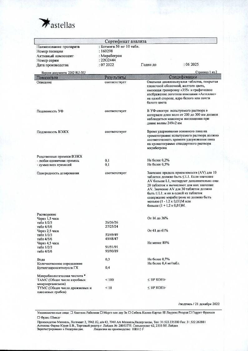 Бетмига 50 мг 30 шт таблетки с пролонгированным высвобождением покрытые пленочной оболочкой