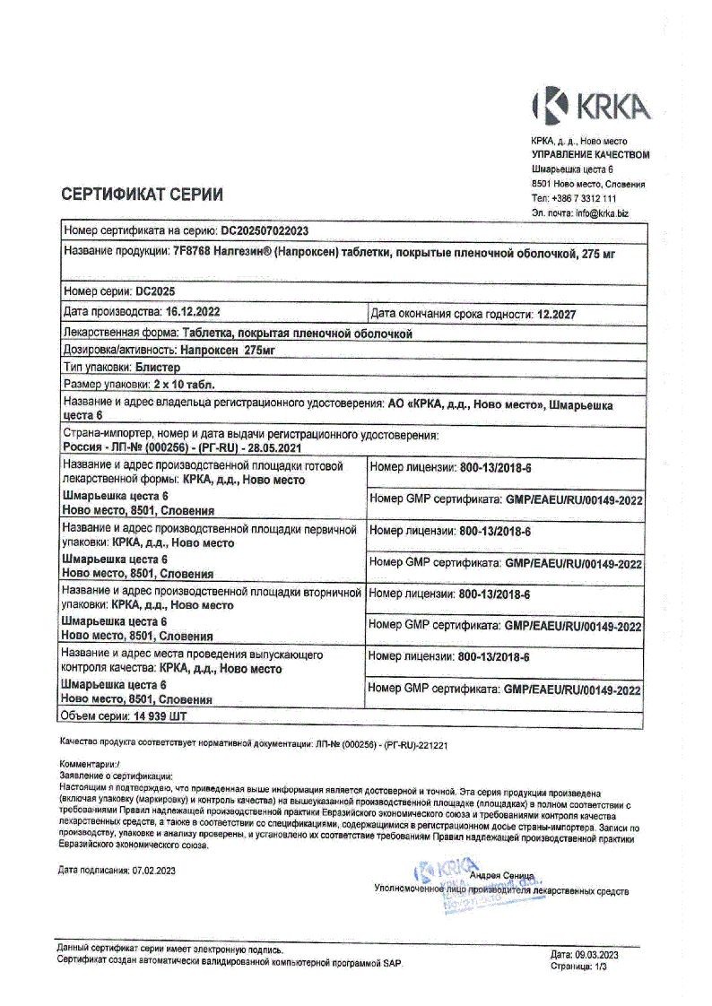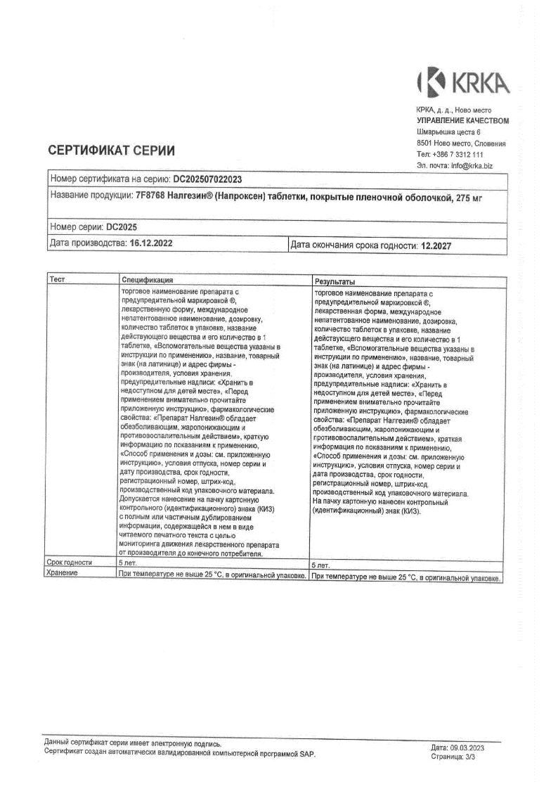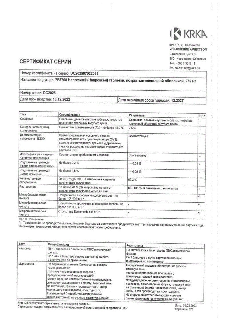 Налгезин Дуо 275 мг + 500 мг 10 шт таблетки покрытые пленочной оболочкой
