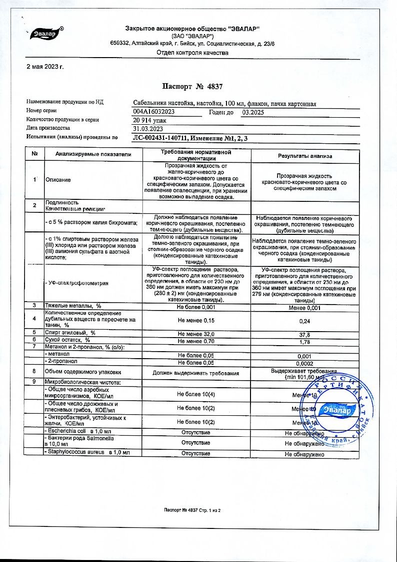 Сабельник Эвалар 100 мл настойка