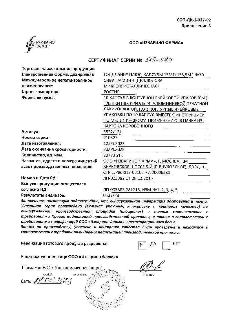Голдлайн Плюс 15 мг + 153,5 мг 90 шт капсулы