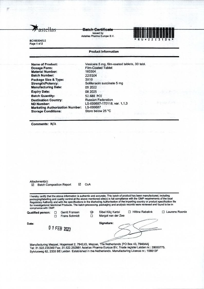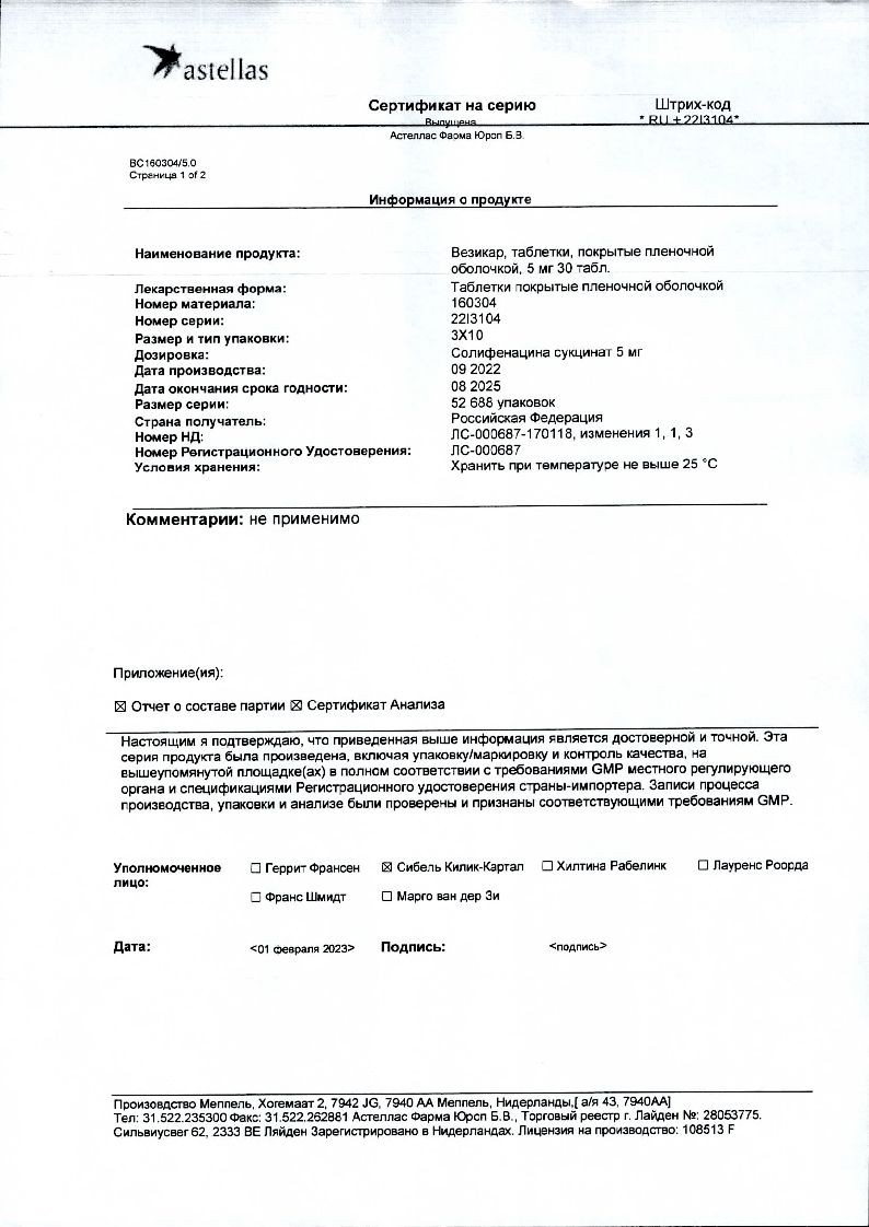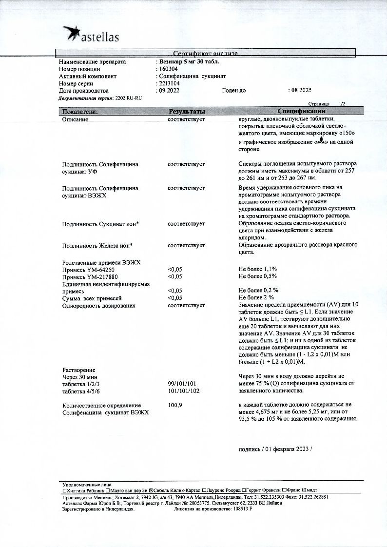 Везикар 5 мг 30 шт таблетки покрытые пленочной оболочкой