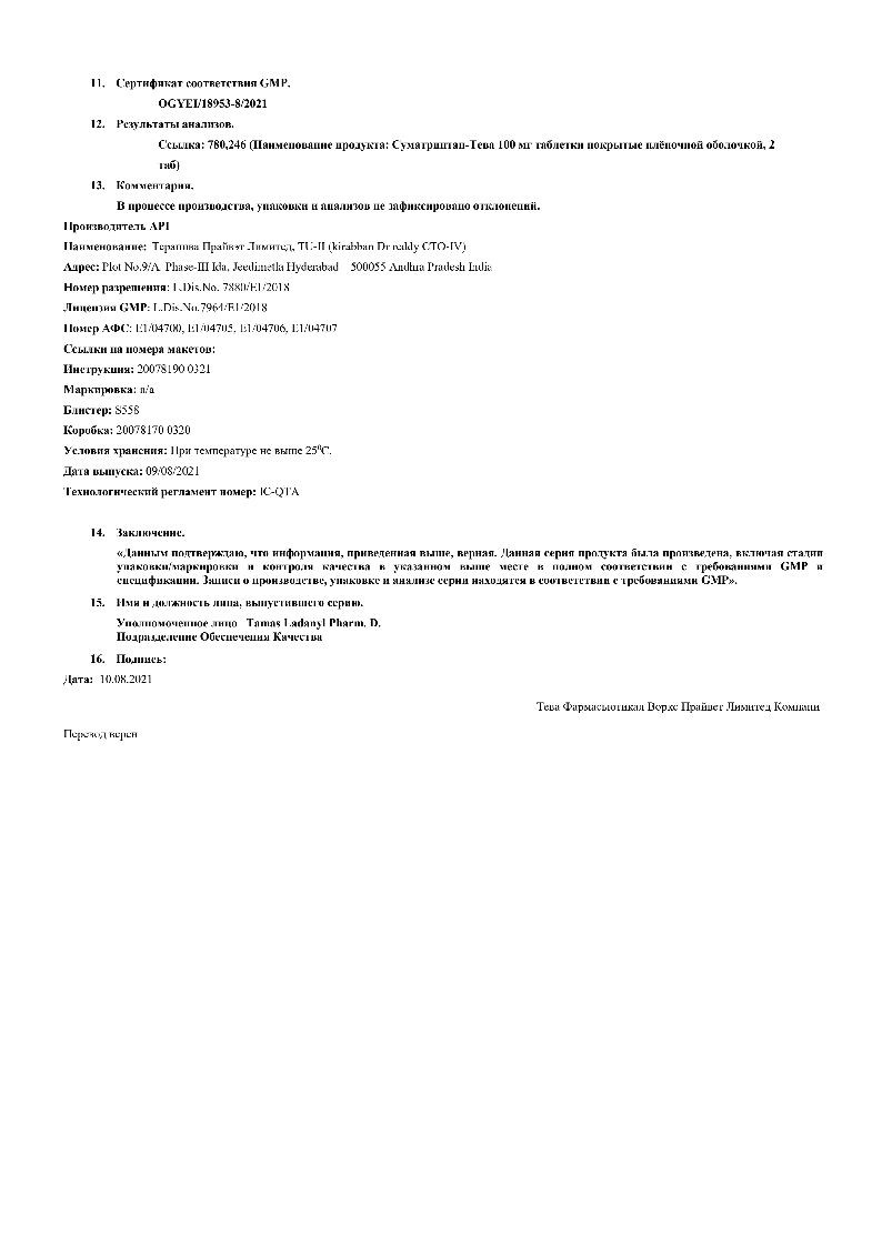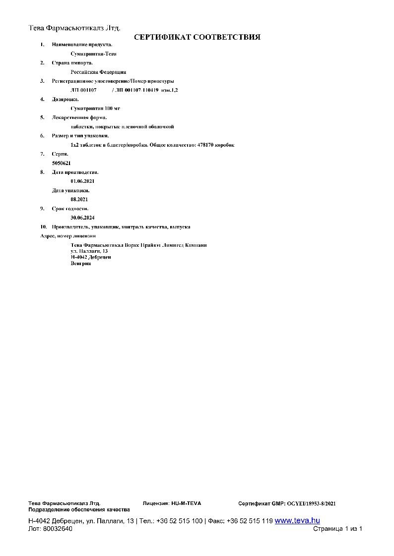 Суматриптан-Тева 100 мг 12 шт таблетки покрытые пленочной оболочкой