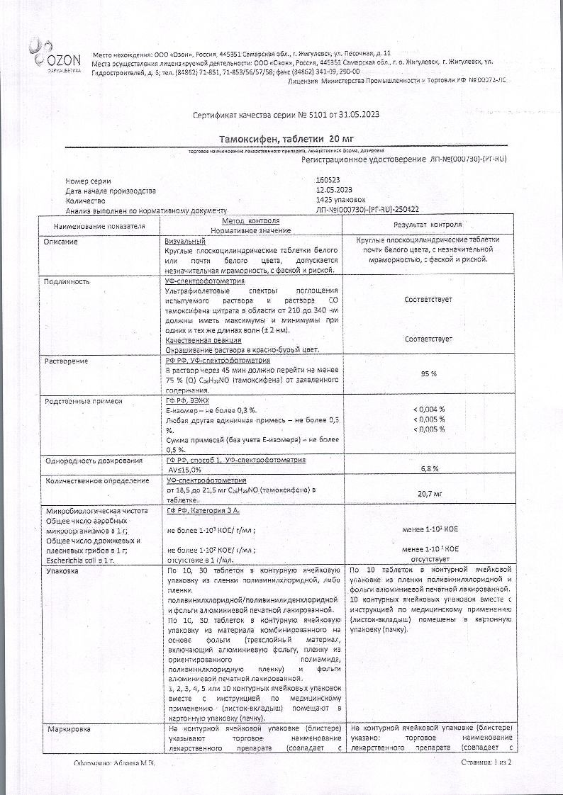 Тамоксифен 20 мг 100 шт таблетки