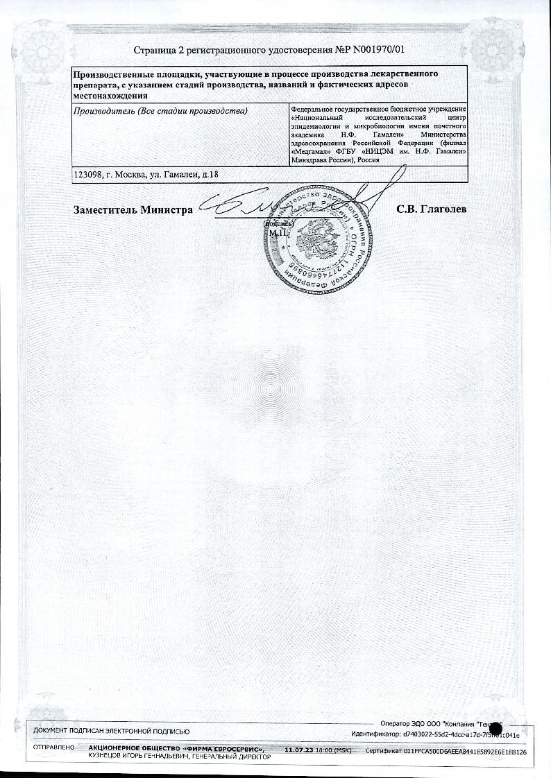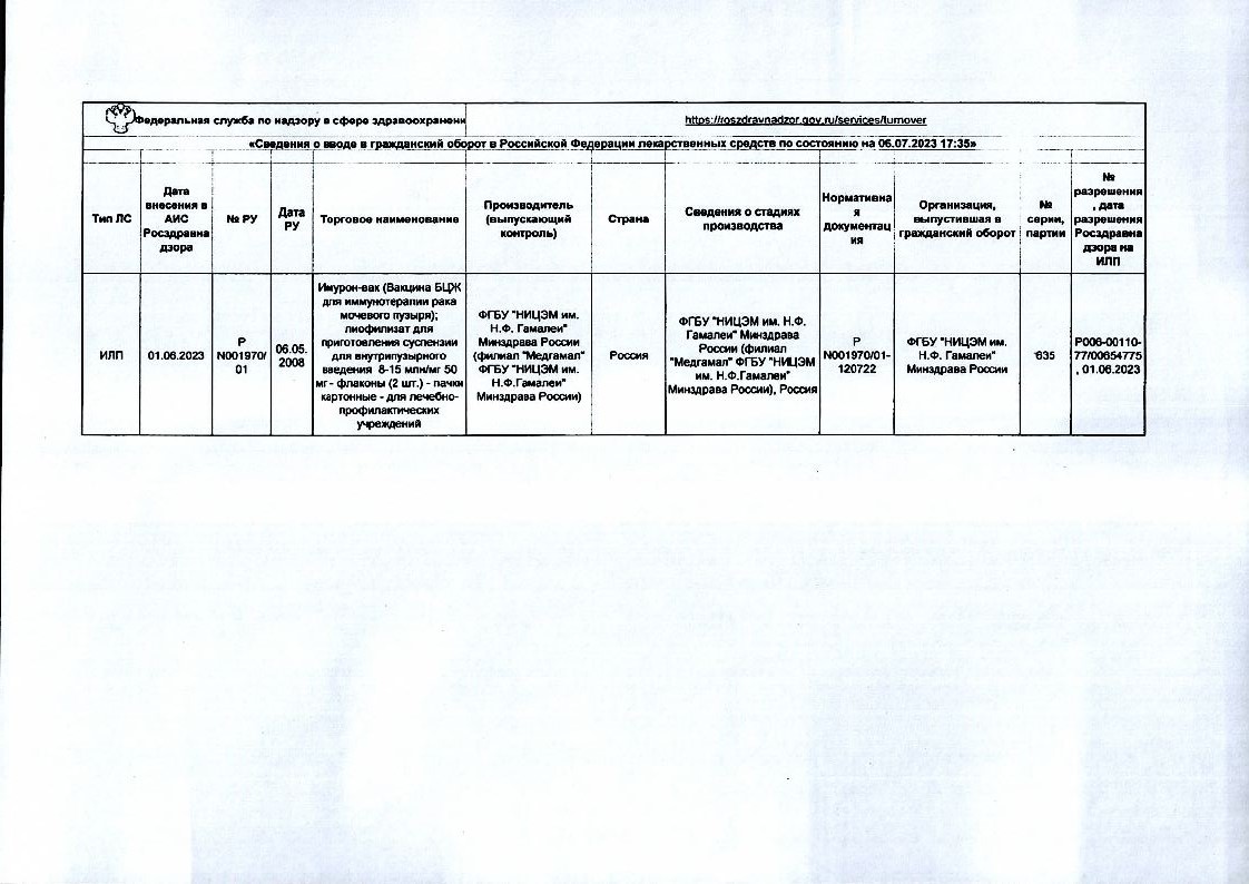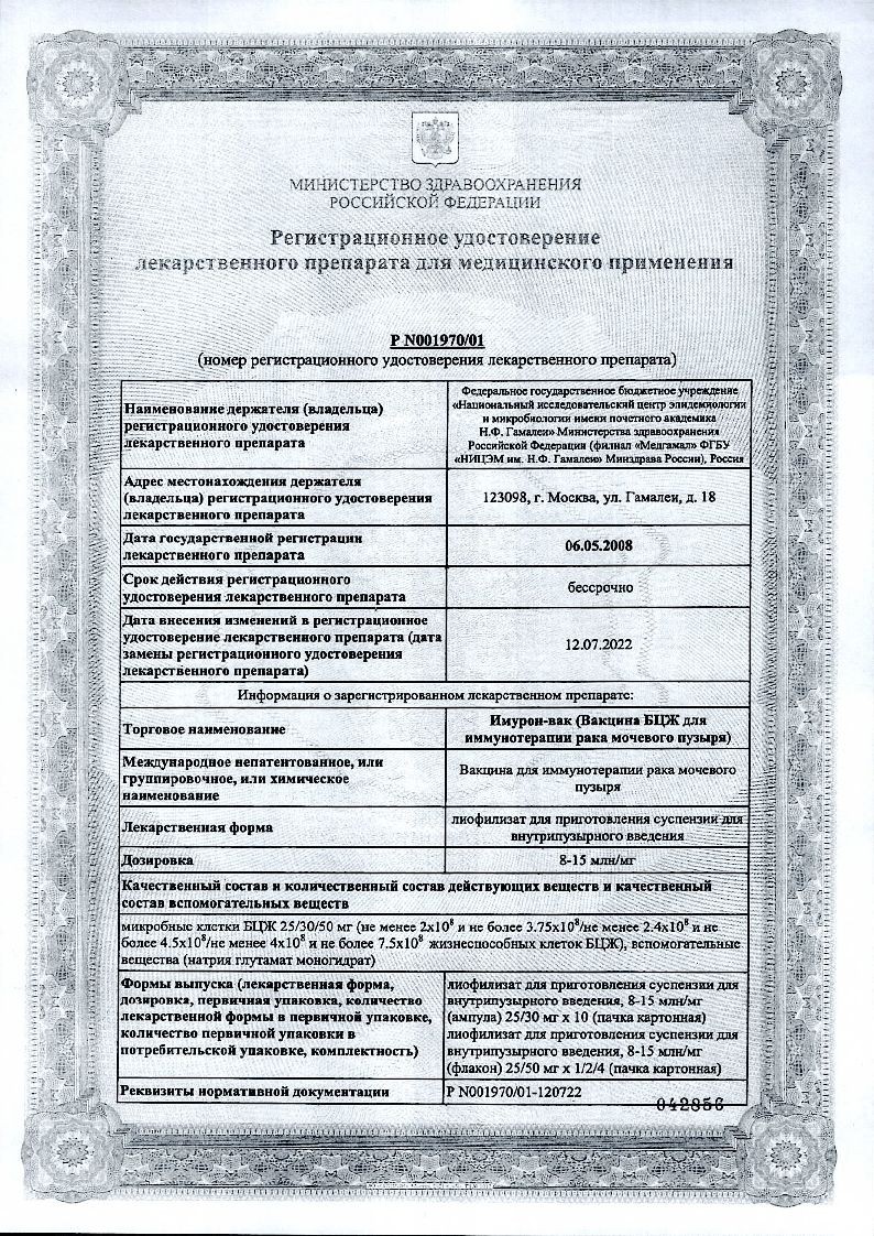 Имурон-Вак (вакцина БЦЖ для иммунотерапии рака мочевого пузыря) 50 мг 8,15 мл 2 шт лиофилизат для суспензии для внутрипузырного введения