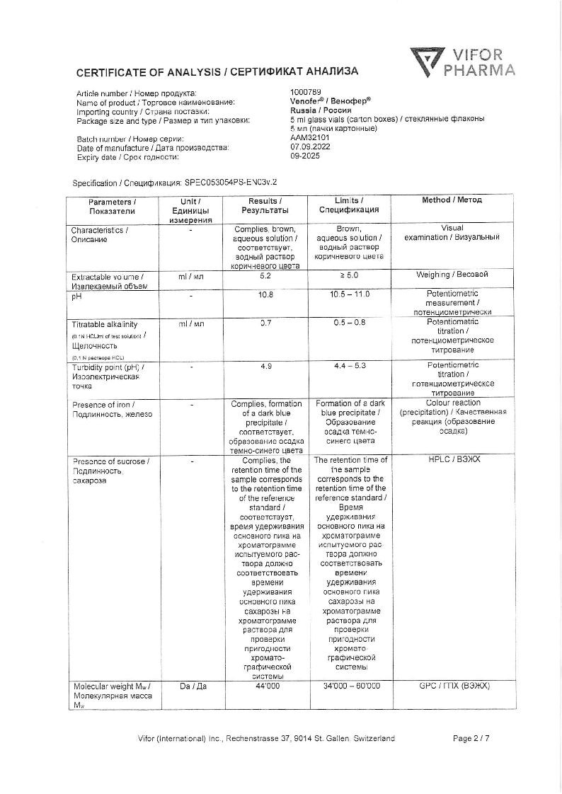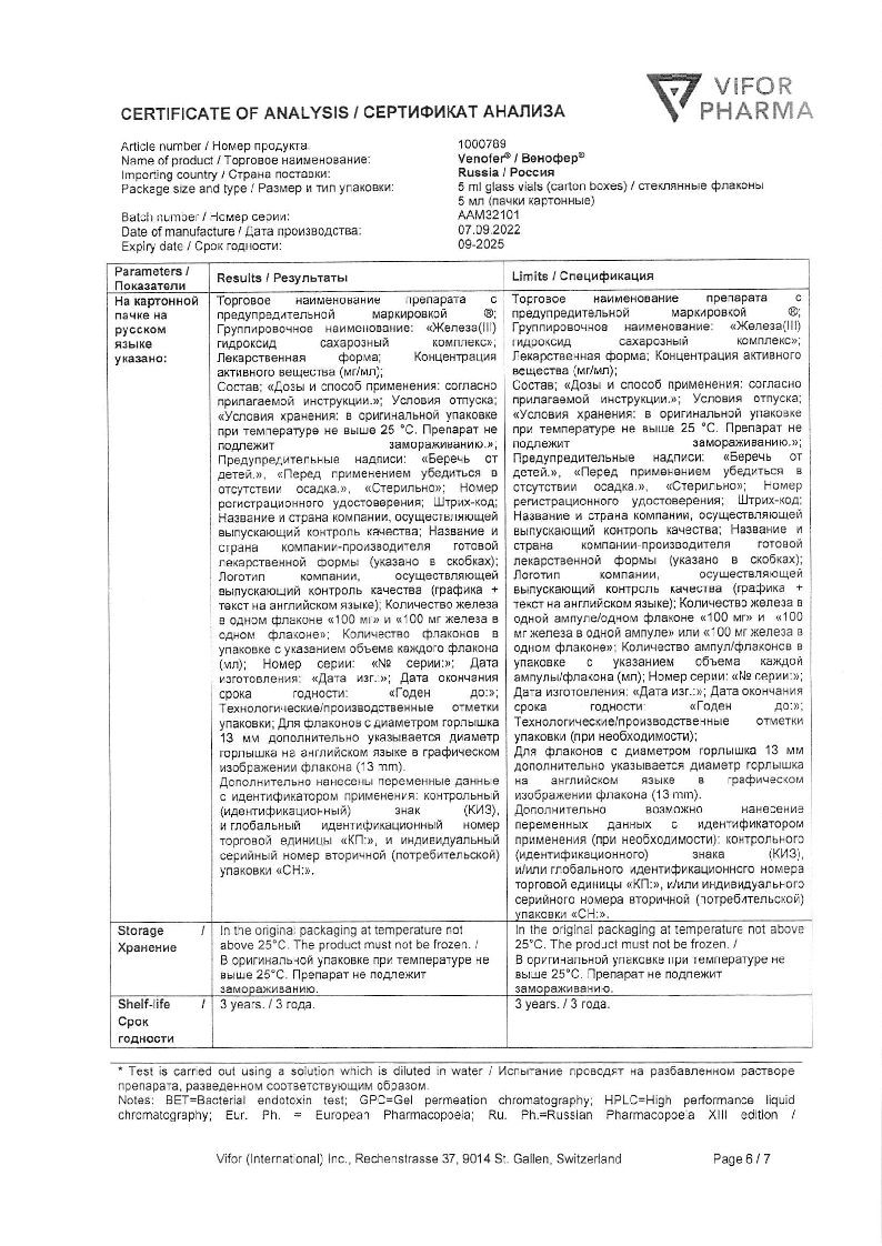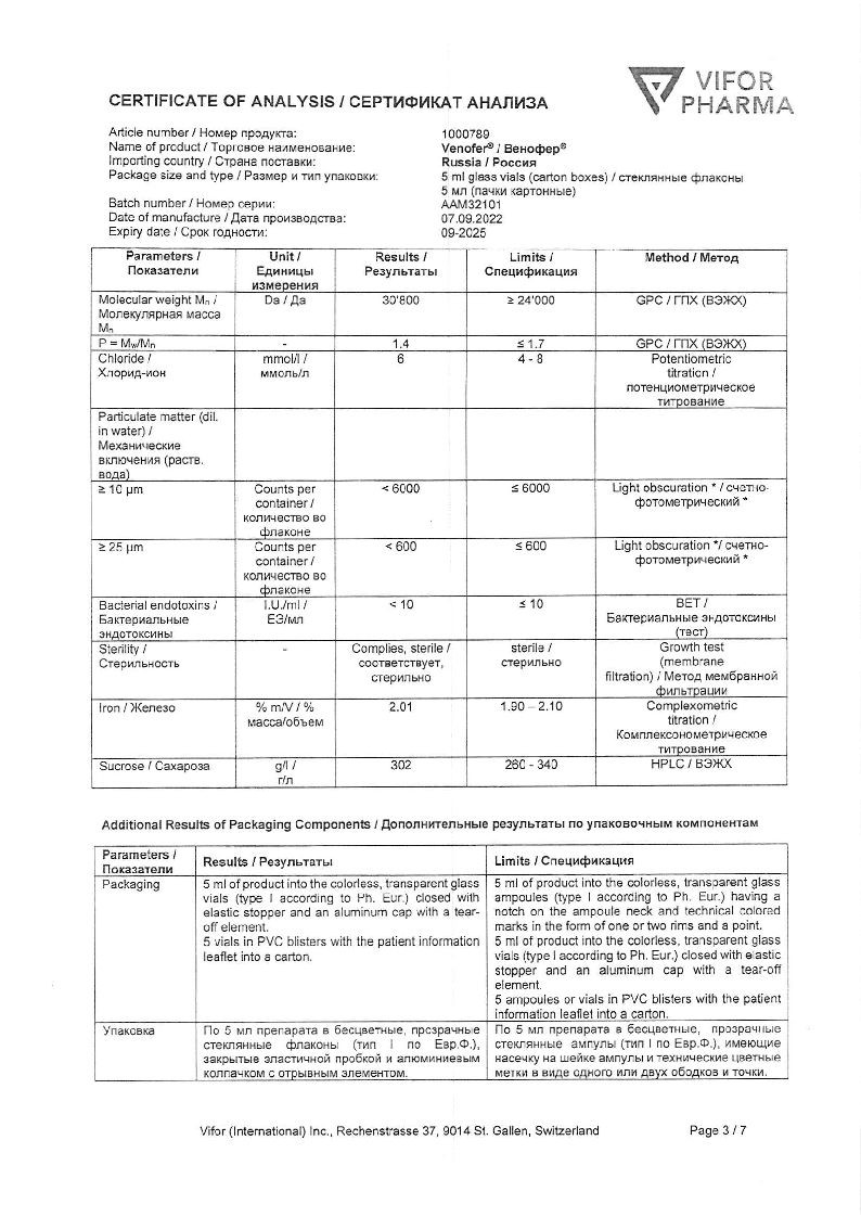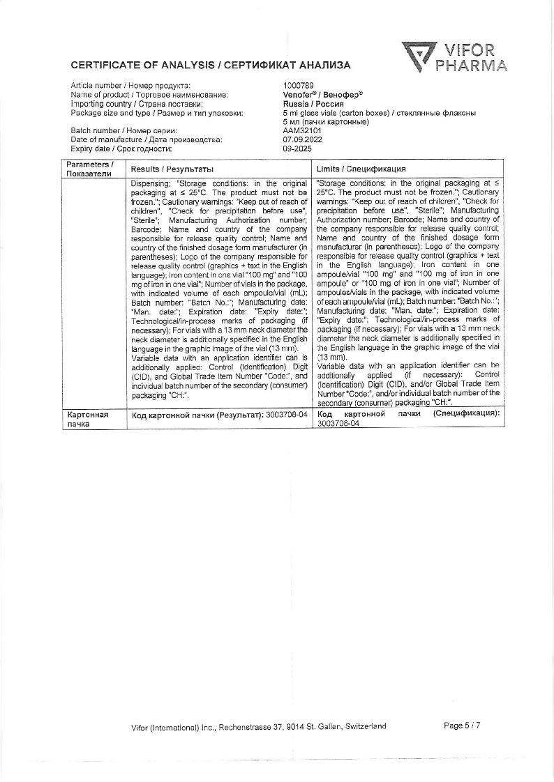 Венофер 20 мг/мл 5 мл 5 шт раствор для внутривенного введения