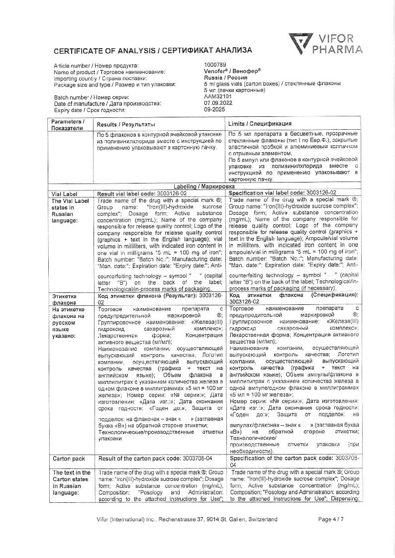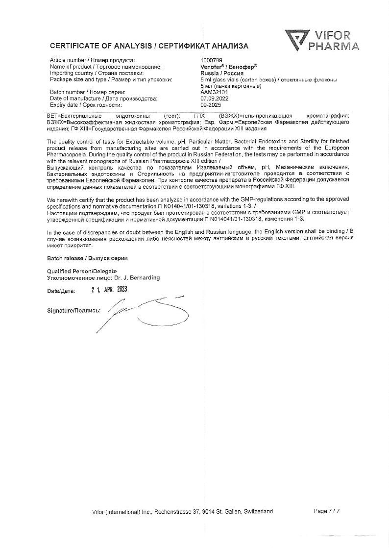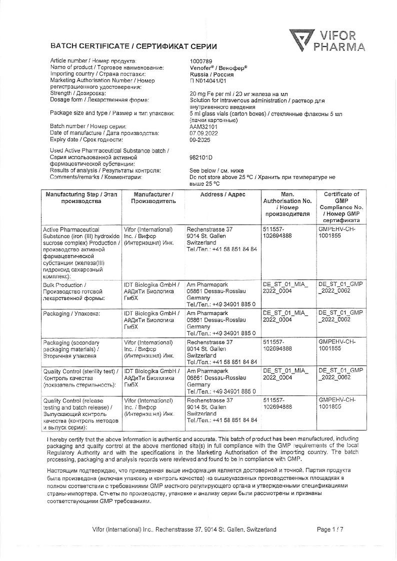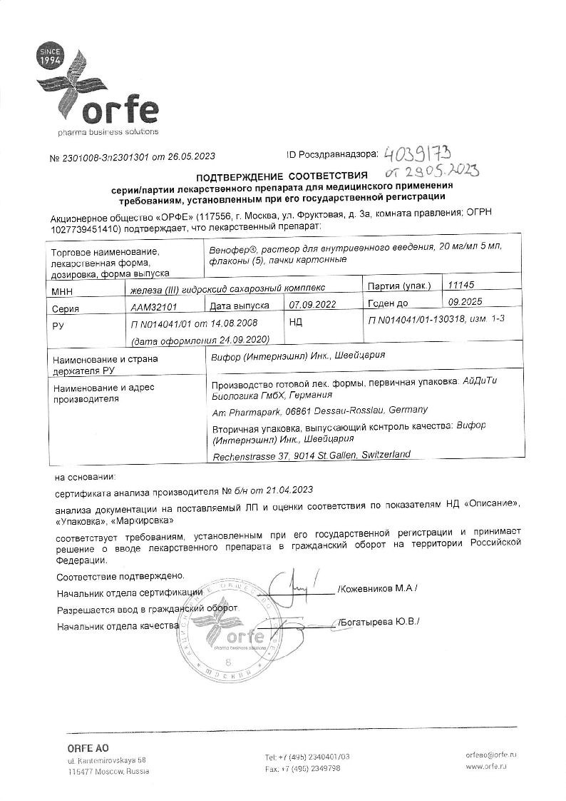 Венофер 20 мг/мл 5 мл 5 шт раствор для внутривенного введения