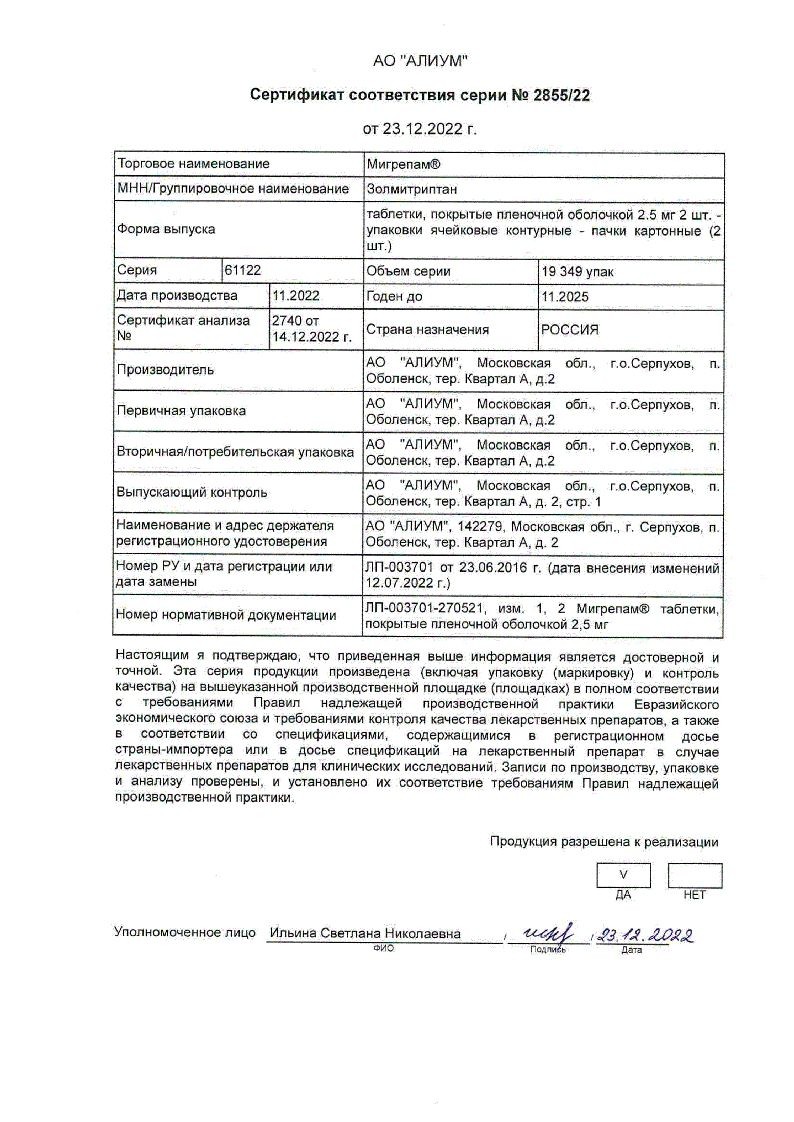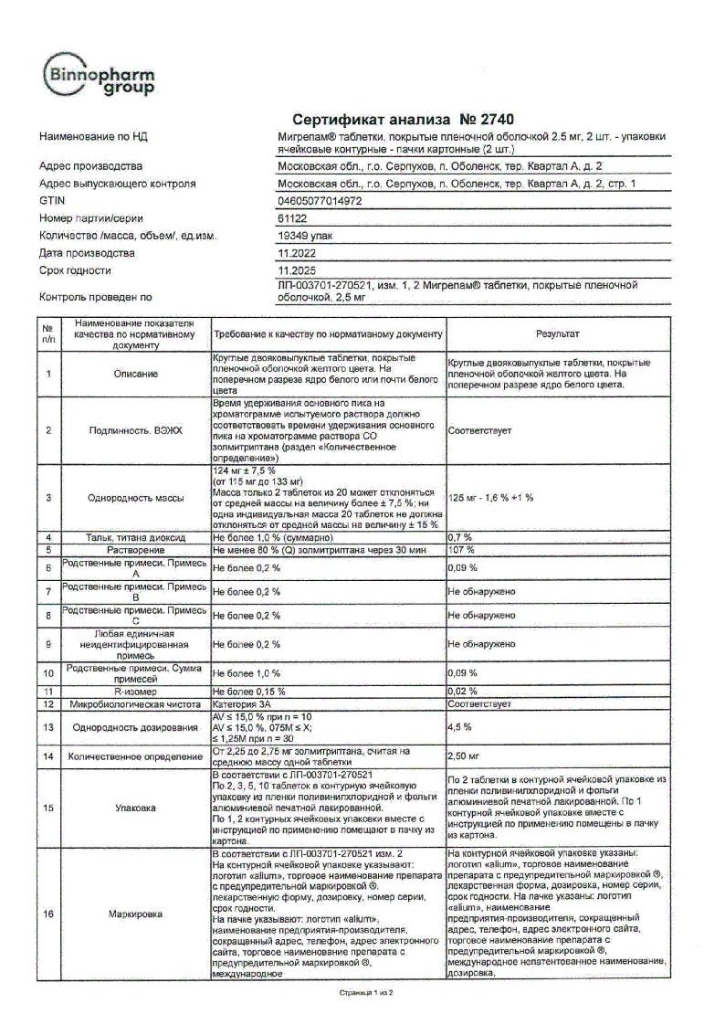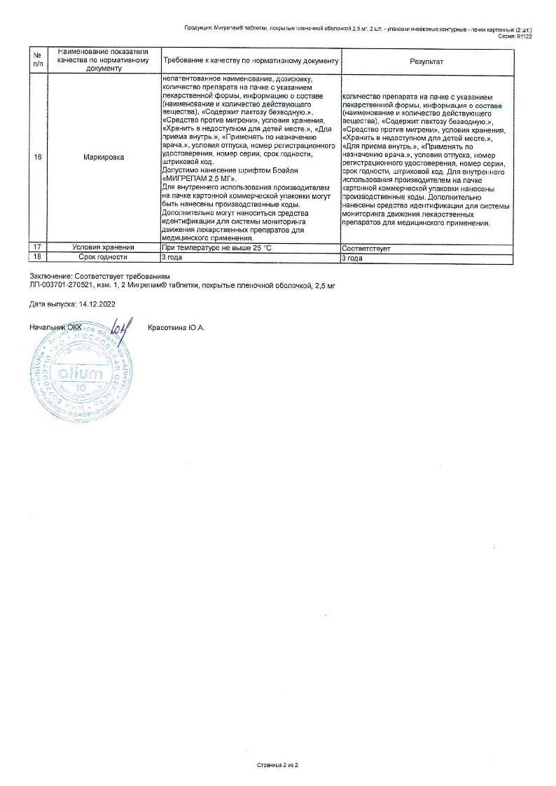 Мигрепам 2,5 мг 2 шт таблетки покрытые пленочной оболочкой