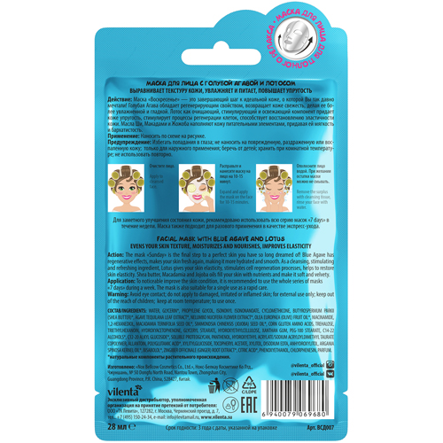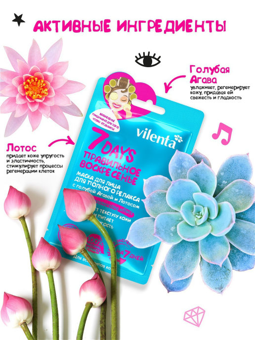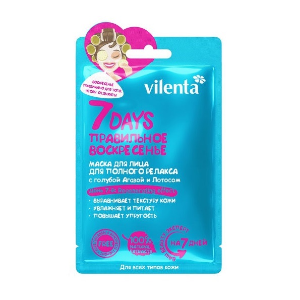 Тканевая маска для лица 7DAYS ПРАВИЛЬНОЕ ВОСКРЕСЕНЬЕ - это завершающий шаг к идеальной коже, о которой Вы так давно мечтали! Маска пропитана ухаживающей сывороткой (эссенцией) с экстрактами голубой Агавы, Лотоса, масла Макадамии, Оливы и Арганы, которая питает, повышает упругость, выравнивает текстуру и тон кожи. Экстракт голубой Агавы регенерирует, возвращает коже свежесть, делая ее более увлажненной и гладкой. Экстракт Лотоса придает коже упругость, стимулирует процессы регенерации клеток, способствует восстановлению эластичности кожи. Масла Ши, Макадамии и Жожоба питают кожу, придавая ей мягкость и бархатистость. Попробуй комплексный уход на 7 дней недели с серией масок для лица от 7DAYS.