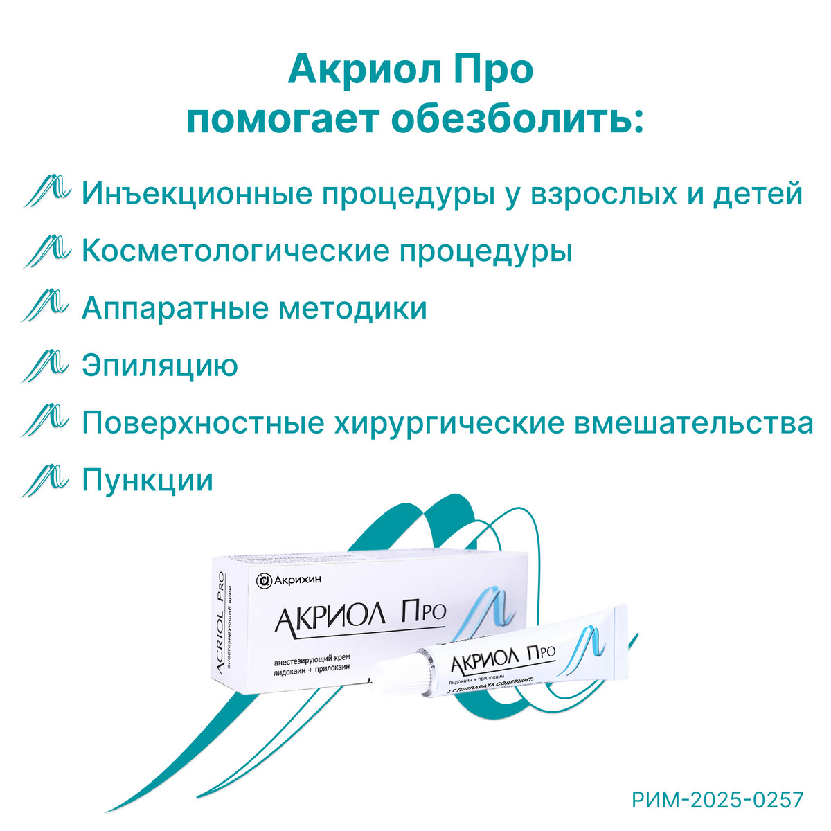 Препарат Акриол Про применяется для поверхностной анестезии кожи при инъекциях (в том числе при вакцинации), пункциях и катетеризации сосудов и поверхностных хирургических вмешательствах, включая небольшие косметологические процедуры и эпиляцию; поверхностной анестезии дефектов кожи, возникающих в результате нарушения питания тканей (трофическая язва) нижних конечностей при хирургической обработке (механической очистке), например, для удаления нерастворимого вещества, образующегося при свертывании крови и выпадающего в виде клубка нитей (фибрин), гноя и некротических тканей; поверхностной анестезии слизистой оболочки половых органов перед проведением болезненных манипуляций и для обезболивания перед инъекциями местных анестетиков у взрослых с 18 лет.