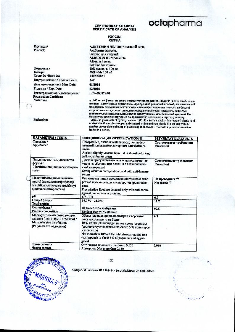 Не было сообщений о передаче вирусов с растворами альбумина, произведенными общепринятыми методами в соответствии со спецификациями Европейской Фармакопеи.
