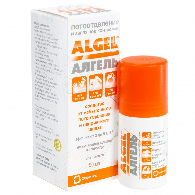 Алгель блокирует выделение жидкости из потовых желез на поверхность кожи. Работа самой потовой железы не нарушается и вырабатываемая жидкость через кровеносные сосуды равномерно перераспределяется к другим областям кожи с менее выраженной склонностью к потоотделению, а также выводится почками. В результате область кожи, обработанная Алгелем, остается сухой. При этом избыточного выделения пота на других участках кожи не происходит.