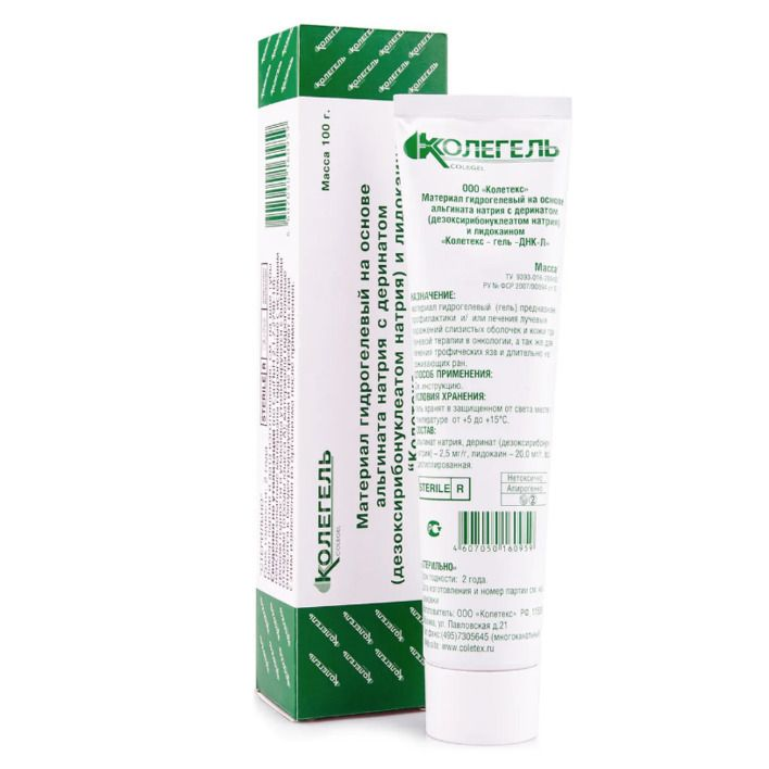 Материал гидрогелевый на основе альгината натрия с деринатом (дезоксирибонуклеатом натрия) и лидокаином «Колетекс-гель –ДНК-Л». Однородная вязкая масса бежево-коричневого цвета с различными оттенками.