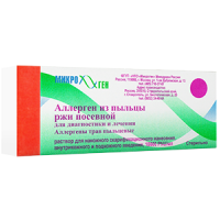 Форма выпуска: Раствор для внутрикожного и подкожного введения, накожного скарификационного нанесения и проведения прик-теста, 10000 PNU/мл. По 5,0 мл аллергена, по 4,5 мл разводящей жидкости, по 4,5 мл тест-контрольной жидкости в стеклянных флаконах, укупоренных резиновыми пробками и закатанных алюминиевыми колпачками. Комплект состоит из 1 флакона аллергена, 1 флакона тест-контрольной жидкости, 7 флаконов разводящей жидкости, 1 пустого стерильного флакона, помещенных в пачку из картона с инструкцией по медицинскому применению.