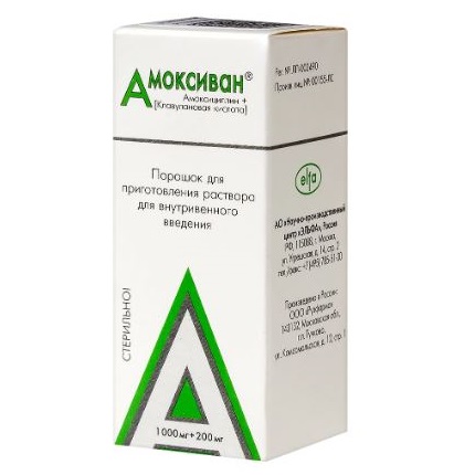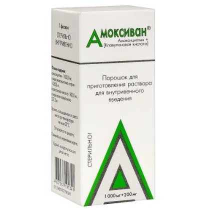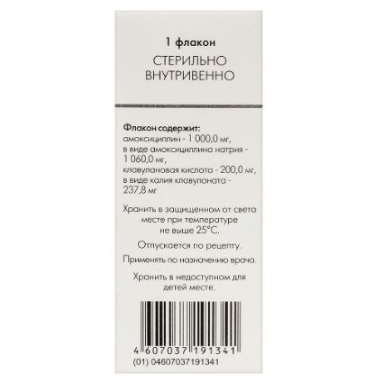 Действующее вещество: амоксициллин 1000,0 мг, в виде амоксициллина натрия 1060,0 мг, клавулановая кислота 200,0 мг, в виде калия клавуланата 237,8 мг.