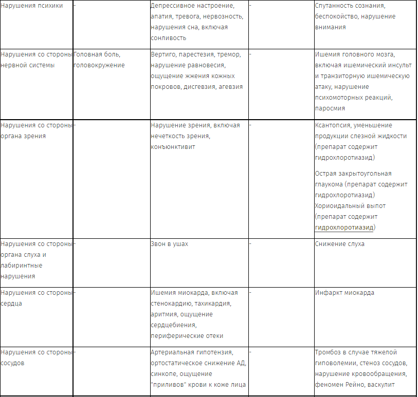 Тиазидные диуретики (включая гидрохлоротиазид) могут вызывать уменьшение ОЦК (гиповолемию) и нарушения водно-электролитного баланса (в т. ч. гипокалиемию, гипонатриемию, гипохлоремический алкалоз). Клиническими симптомами нарушений водно-электролитного баланса являются сухость слизистой оболочки полости рта, жажда, слабость, вялость, утомляемость, сонливость, беспокойство, мышечная боль или судороги, мышечная слабость, выраженное снижение АД, олигурия, тахикардия, аритмия и нарушения со стороны ЖКТ (такие как тошнота и рвота). У пациентов, получающих терапию гидрохлоротиазидом (особенно при продолжительном курсовом лечении), следует выявлять клинические симптомы нарушений водно-электролитного баланса и регулярно контролировать содержание электролитов в плазме крови.