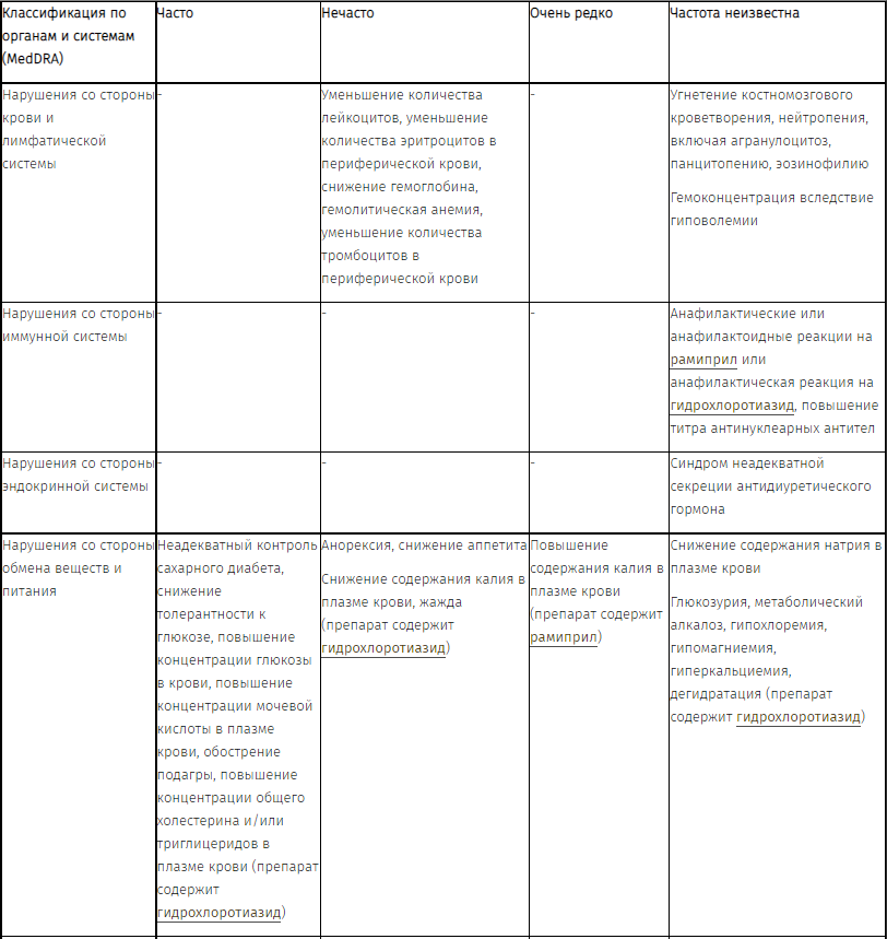 Профиль безопасности комбинации гидрохлоротиазид + рамиприл включает нежелательные реакции, возникающие на фоне артериальной гипотензии и/или гиповолемии в силу увеличения диуреза. Действующее вещество рамиприл может вызывать постоянный "сухой" кашель, в то время как действующее вещество гидрохлоротиазид может ухудшить метаболизм глюкозы, липидов и мочевой кислоты. Два действующих вещества оказывают противоположное влияние на содержание калия в плазме крови. Серьезные нежелательные реакции включают ангионевротический отек или анафилактическую реакцию, нарушение функции почек или печени, панкреатит, тяжелые кожные реакции и нейтропению/агранулоцитоз.