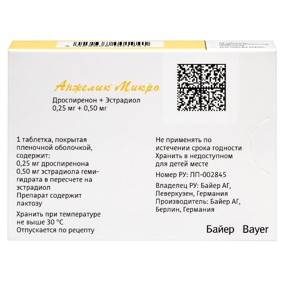 Препарат Анжелик® Микро содержит 17β-эстрадиол, химически и биологически идентичный эндогенному эстрадиолу человека, и синтетический прогестаген, дроспиренон. 17β-эстрадиол обеспечивает замещение эстрогенов в женском организме во время и после наступления менопаузы. Добавление дроспиренона обеспечивает контроль над кровотечениями и предотвращает развитие обусловленной эстрогенами гиперплазии эндометрия.
