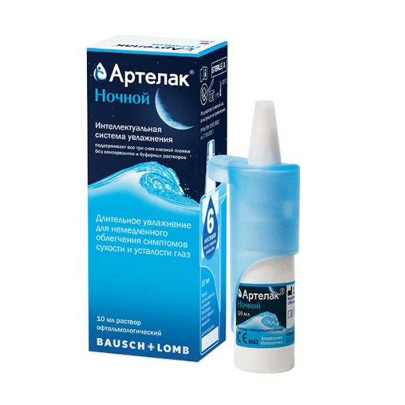 Артелак® Ночной – средство для сохранения здорового состояния поверхности глаза, распределяется на поверхности и обеспечивает интенсивное увлажнение для немедленного и длительного облегчения симптомов. Это идеальный продукт для любого потребителя, страдающего от таких симптомов сухости глаз, как усталость, раздражение, жжение и/или слезоточивость.