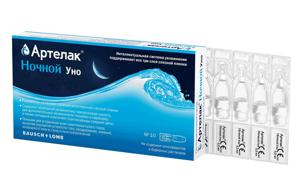 Артелак® Ночной Уно это средство для комплексного увлажнения, которое поддерживает все три слоя слезной пленки: липидную, водную и слизистую фазу с целью улучшения и поддержания увлажненности глазной поверхности при любых симптомах сухости и дискомфорта в глазах.