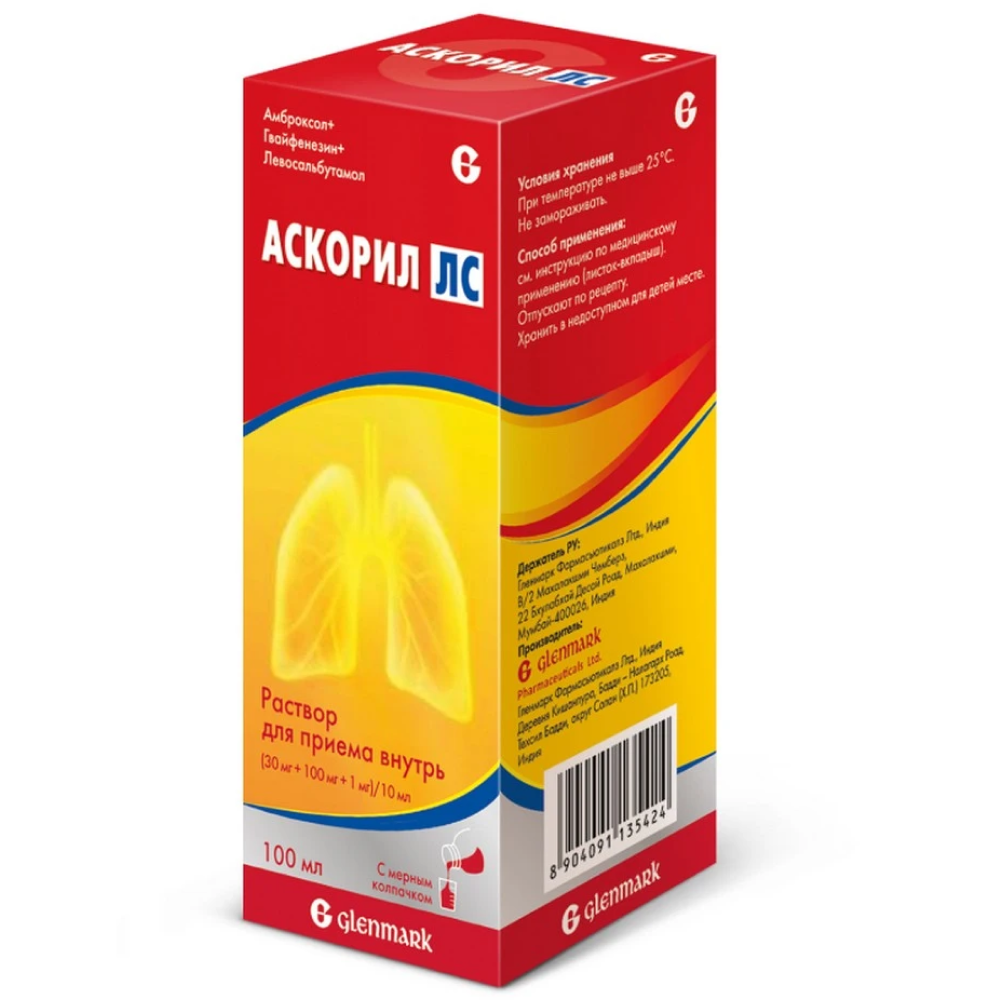 Препарат Аскорил ЛС содержит 3 действующих вещества: амброксол, гвайфенезин, левосальбутамол.