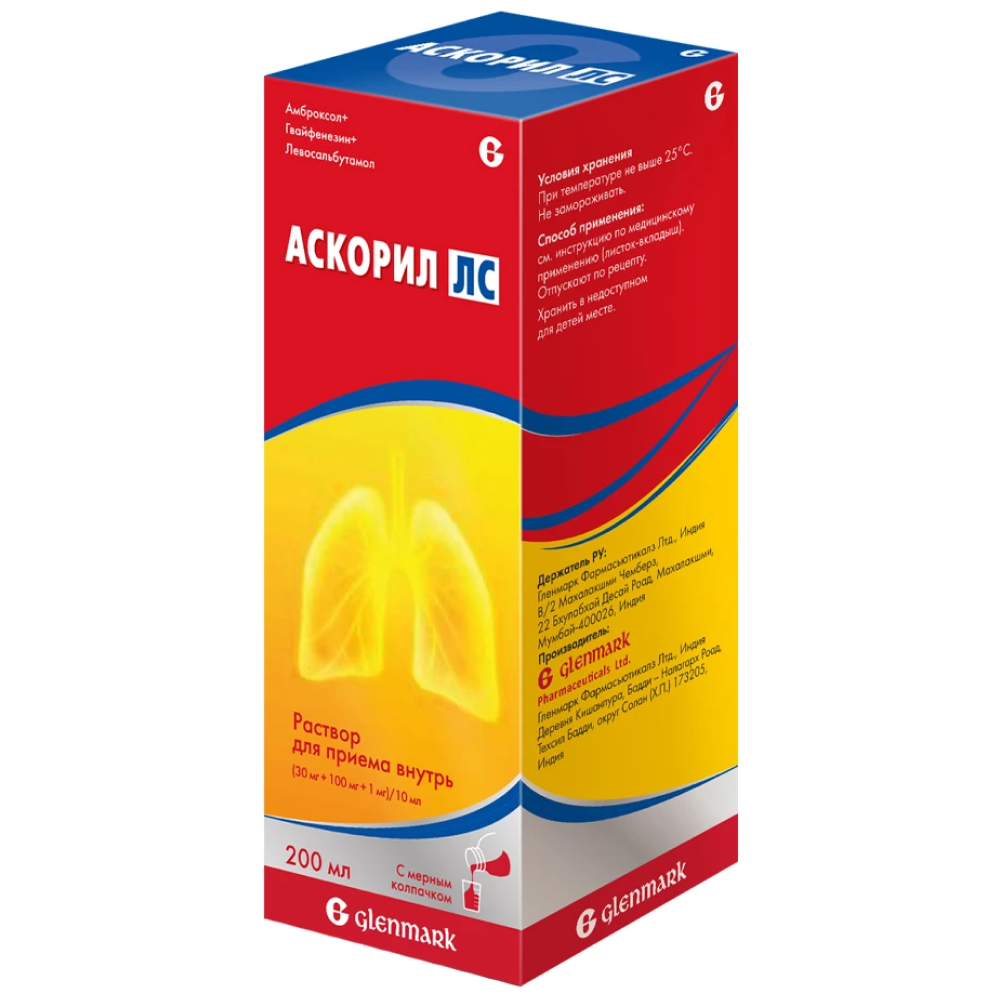 Препарат Аскорил ЛС содержит 3 действующих вещества: амброксол, гвайфенезин, левосальбутамол.
