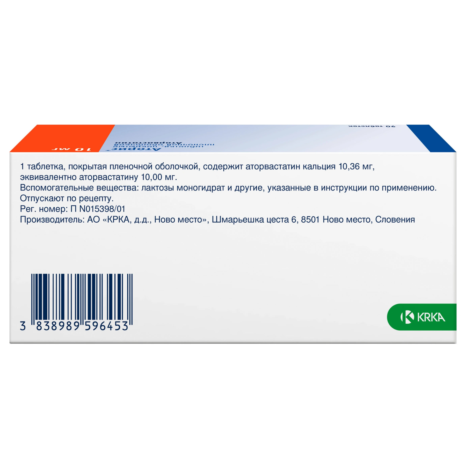 Действующее вещество: аторвастатин кальция 10.36 мг, эквивалентно аторвастатину 10 мг.