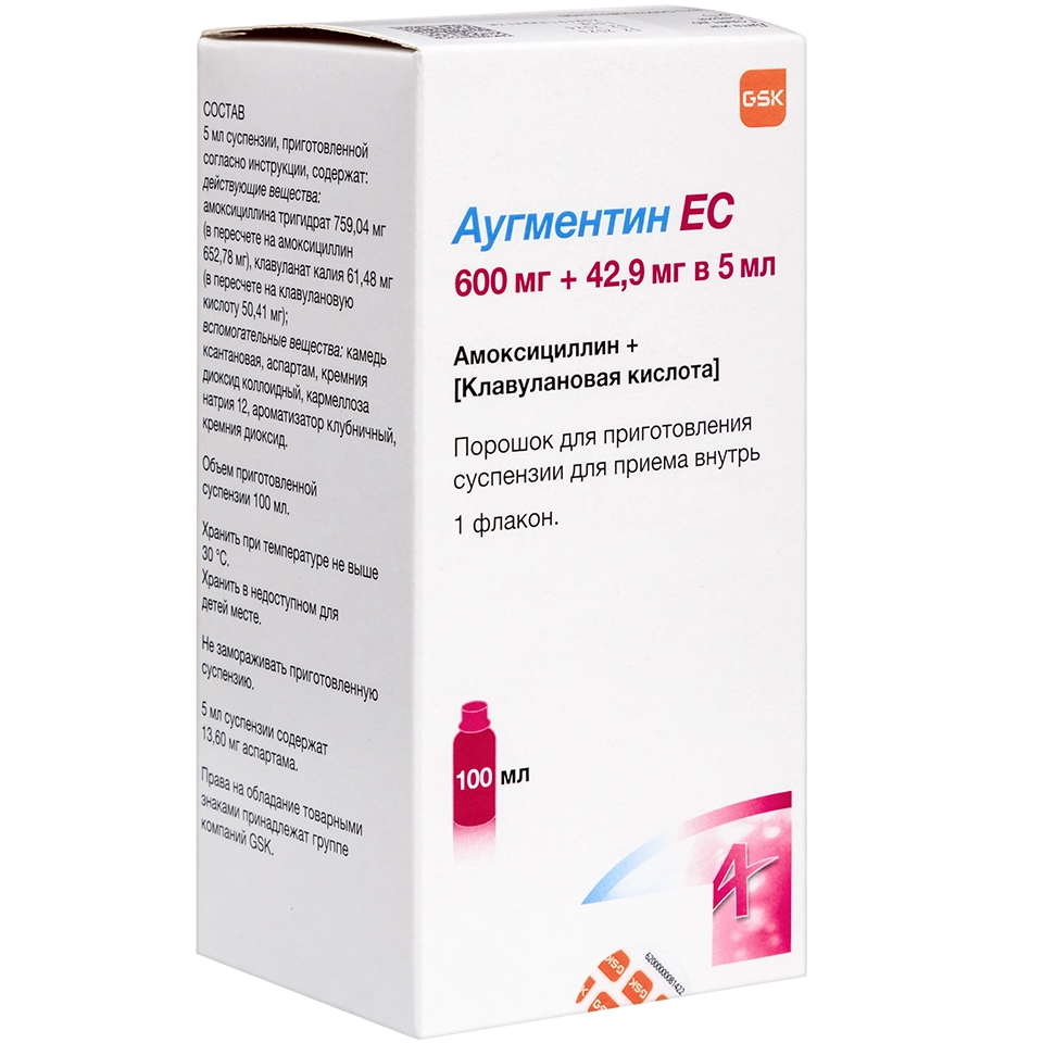 По содержанию клавулановой кислоты препарат Аугментин® ЕС отличается от других суспензий, содержащих амоксициллин и клавулановую кислоту. Препарат Аугментин® ЕС содержит 600 мг амоксициллина и 42.9 мг клавулановой кислоты в 5 мл восстановленной суспензии, в то время как препараты, содержащие 200 мг и 400 мг амоксициллина в 5 мл суспензии, содержат соответственно 28.5 мг и 57 мг клавулановой кислоты в 5 мл суспензии. Препараты в форме суспензий дозировкой 200 мг амоксициллина в 5 мл, 400 мг амоксициллина в 5 мл и препарат Аугментин® ЕС не являются взаимозаменяемыми.