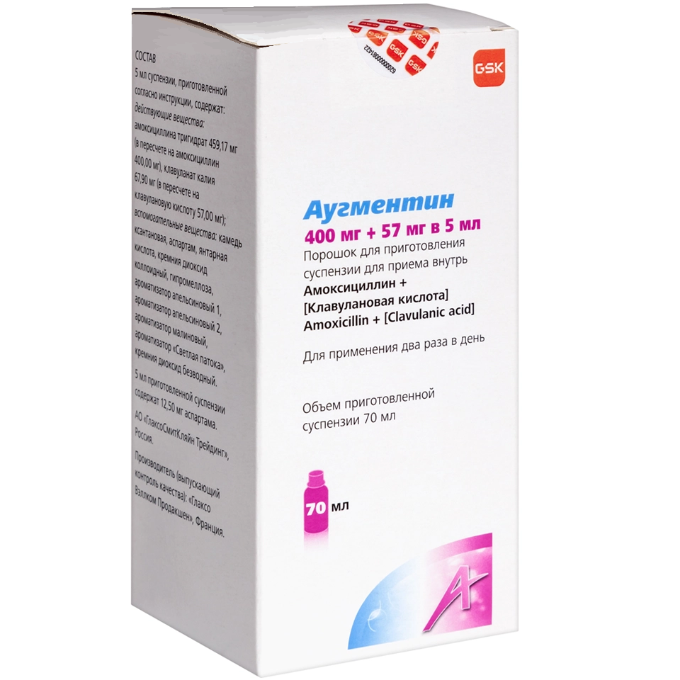 Для детей младше 2 лет отмеренную разовую дозу суспензии препарата Аугментин® можно развести водой в отношении 1:1.