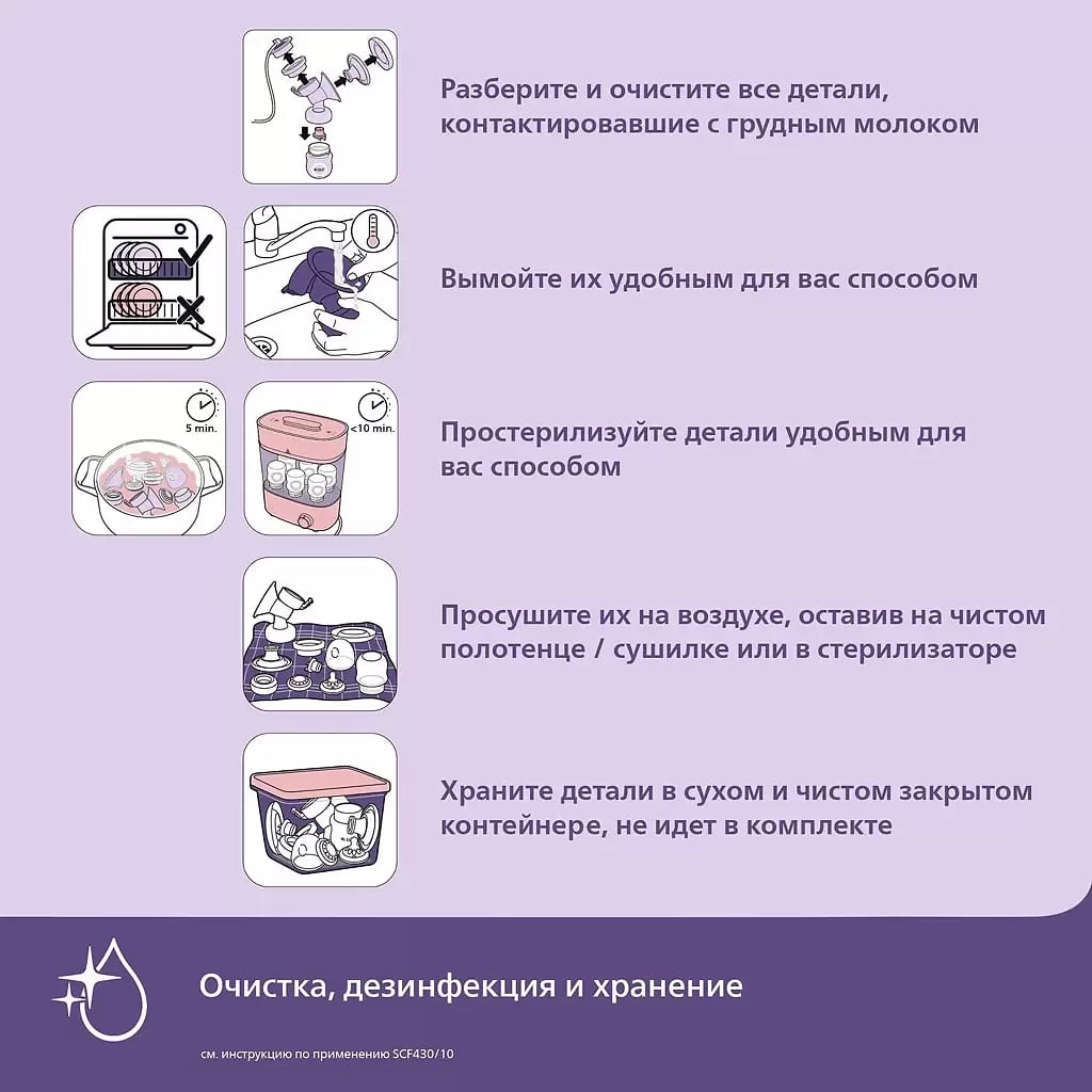 Небольшое количество деталей молокоотсоса позволяют без труда собирать и очищать молокоотсос.